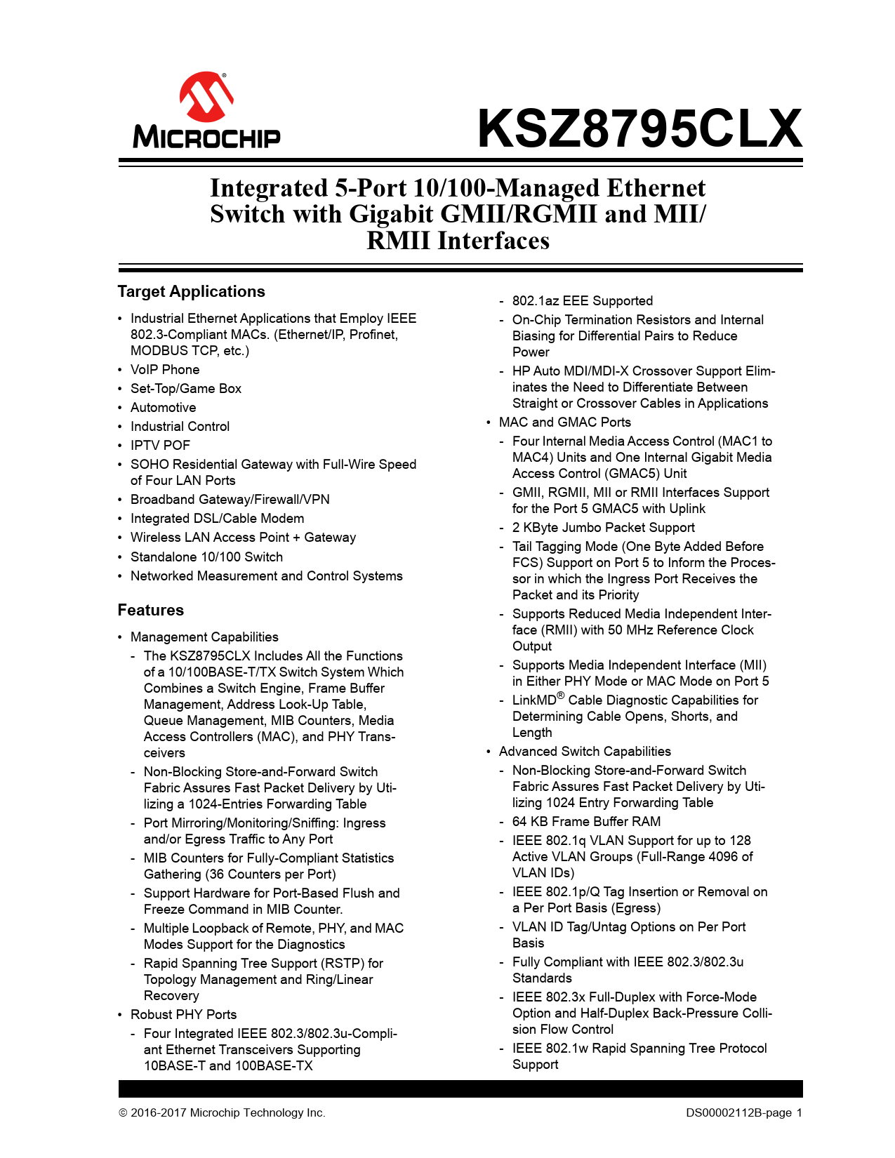 KSZ8795CLXIntegrated 5-Port 10/100-Managed EthernetSwitch with Gigabit GMII/RGMII and MII/RMII Interfaces - Target Applications - 802.1az EEE Supported • Industrial Ethernet Applications that Employ IEEE - On-Chip Termination Resistors and Internal 802.3-Compliant MACs. (Ethernet/IP, Profinet, Biasing for Differential Pairs to Reduce MODBUS TCP, etc.) Power • VoIP Phone - HP Auto MDI/MDI-X Crossover Support Elim- • Set-Top/Game Box inates the Need to Differentiate Between • Automotive Straight or Crossover Cables in Applications • Industrial Control • MAC and GMAC Ports • IPTV POF - Four Internal Media Access Control (MAC1 to • SOHO Residential Gateway with Full-Wire Speed MAC4) Units and One Internal Gigabit Media of Four LAN Ports Access Control (GMAC5) Unit • Broadband Gateway/Firewall/VPN - GMII, RGMII, MII or RMII Interfaces Support for the Port 5 GMAC5 with Uplink • Integrated DSL/Cable Modem - 2 KByte Jumbo Packet Support • Wireless LAN Access Point + Gateway - Tail Tagging Mode (One Byte Added Before • Standalone 10/100 Switch FCS) Support on Port 5 to Inform the Proces- • Networked Measurement and Control Systems sor in which the Ingress Port Receives the Packet and its Priority Features - Supports Reduced Media Independent Inter- face (RMII) with 50 MHz Reference Clock • Management Capabilities Output - The KSZ8795CLX Includes All the Functions - Supports Media Independent Interface (MII) of a 10/100BASE-T/TX Switch System Which Combines a Switch Engine, Frame Buffer in Either PHY Mode or MAC Mode on Port 5 Management, Address Look-Up Table, - LinkMD® Cable Diagnostic Capabilities for Queue Management, MIB Counters, Media Determining Cable Opens, Shorts, and Access Controllers (MAC), and PHY Trans- Length ceivers • Advanced Switch Capabilities - Non-Blocking Store-and-Forward Switch - Non-Blocking Store-and-Forward Switch Fabric Assures Fast Packet Delivery by Uti- Fabric Assures Fast Packet Delivery by Uti- lizing a 1024-Entries Forwarding Table lizing 1024 Entry Forwarding Table - Port Mirroring/Monitoring/Sniffing: Ingress - 64 KB Frame Buffer RAM and/or Egress Traffic to Any Port - IEEE 802.1q VLAN Support for up to 128 - MIB Counters for Fully-Compliant Statistics Active VLAN Groups (Full-Range 4096 of Gathering (36 Counters per Port) VLAN IDs) - Support Hardware for Port-Based Flush and - IEEE 802.1p/Q Tag Insertion or Removal on Freeze Command in MIB Counter. a Per Port Basis (Egress) - Multiple Loopback of Remote, PHY, and MAC - VLAN ID Tag/Untag Options on Per Port Modes Support for the Diagnostics Basis - Rapid Spanning Tree Support (RSTP) for - Fully Compliant with IEEE 802.3/802.3u Topology Management and Ring/Linear Standards Recovery - IEEE 802.3x Full-Duplex with Force-Mode • Robust PHY Ports Option and Half-Duplex Back-Pressure Colli- - Four Integrated IEEE 802.3/802.3u-Compli- sion Flow Control ant Ethernet Transceivers Supporting - IEEE 802.1w Rapid Spanning Tree Protocol 10BASE-T and 100BASE-TX Support 2016-2017 Microchip Technology Inc. DS00002112B-page 1 Document Outline Integrated 5-Port 10/100-Managed Ethernet Switch with Gigabit GMII/RGMII and MII/ RMII Interfaces 1.0 Introduction 1.1 General Description FIGURE 1-1: Functional Block Diagram 2.0 Pin Description and Configuration FIGURE 2-1: 80-LQFP Pin Assignment (TOP View) TABLE 2-1: Signals - KSZ8795CLX (Continued) TABLE 2-2: Strap-in Options - KSZ8795CLX (Continued) 3.0 Functional Description 3.1 Physical Layer (PHY) 3.1.1 100BASE-TX Transmit 3.1.2 100BASE-TX Receive 3.1.3 PLL Clock Synthesizer 3.1.4 Scrambler/De-Scrambler (100BASE-TX Only) 3.1.5 10BASE-T Transmit 3.1.6 10BASE-T Receive 3.1.7 MDI/MDI-X Auto Crossover TABLE 3-1: MDI/MDI-X Pin Definitions FIGURE 3-1: Typical Straight Cable Connection FIGURE 3-2: Typical Crossover Cable Connection 3.1.8 Auto-Negotiation FIGURE 3-3: Auto-Negotiation and PArallel Operation 3.1.9 LinkMD® Cable Diagnostics 3.1.10 On-Chip Termination and Internal Biasing 3.2 Media Access Controller (MAC) Operation 3.2.1 Inter-Packet Gap (IPG) 3.2.2 Backoff Algorithm 3.2.3 Late Collision 3.2.4 Illegal Frames 3.2.5 Flow Control 3.2.6 Half-Duplex Back Pressure 3.2.7 Broadcast Storm Protection 3.3 Switch Core 3.3.1 Address Look-Up 3.3.2 learning 3.3.3 Migration 3.3.4 Aging 3.3.5 Forwarding FIGURE 3-4: Destination Address Lookup and Resolution Flow Chart 3.3.6 Switching Engine 3.4 Power and Power Management TABLE 3-2: KSZ8795CLX Voltage Options and Requirements (Continued) TABLE 3-3: Internal Function Block Status 3.4.1 Normal Operation Mode 3.4.2 Energy Detect Mode 3.4.3 Soft Power-Down Mode 3.4.4 Port-Based Power-Down Mode 3.4.5 Energy Efficient Ethernet (EEE) FIGURE 3-5: IEEE Transmit and Receive Signaling Paths FIGURE 3-6: Traffic Activity and EEE LPI Operations 3.4.6 Wake-on-LAN (WoL) 3.4.7 Interrupt (INT_N/PME_N) 3.5 Interfaces TABLE 3-4: Available Interfaces 3.5.1 Configuration Interface TABLE 3-5: SPI Connections FIGURE 3-7: SPI Access Timing FIGURE 3-8: SPI Multiple Access Timing TABLE 3-6: MII Management Interface Frame Format (Note 3-1) 3.5.2 Switch Port 5 GMAC Interface TABLE 3-7: Signals of GMII/RGMII/MII/RMII TABLE 3-8: Port 5 SW5-MII Connection TABLE 3-9: Port 5 SW5-GMII Connection (Continued) TABLE 3-10: Port 5 SW5-RGMII Connection TABLE 3-11: Port 5 Sw5-RGMII Clock Delay Configuration with Connection Partner (Continued) TABLE 3-12: Port 5 SW5-RMII Connection 3.6 Advanced Functionality 3.6.1 QoS Priority Support FIGURE 3-9: 802.1p Priority field Format 3.6.2 Spanning Tree Support TABLE 3-13: Port Setting and Software Actions for Spanning Tree 3.6.3 Rapid Spanning Tree Support TABLE 3-14: Port Setting and Software Actions for Rapid Spanning Tree 3.6.4 Tail Tagging Mode FIGURE 3-10: Tail Tag Frame Format TABLE 3-15: Tail Tag Rules 3.6.5 IGMP Support 3.6.6 IPv6 MLD Snooping 3.6.7 Port Mirroring Support 3.6.8 VLAN Support TABLE 3-16: FID+DA Look-Up in VLAN Mode (Continued) TABLE 3-17: FID+SA Look-Up in VLAN Mode 3.6.9 Rate Limiting Supp