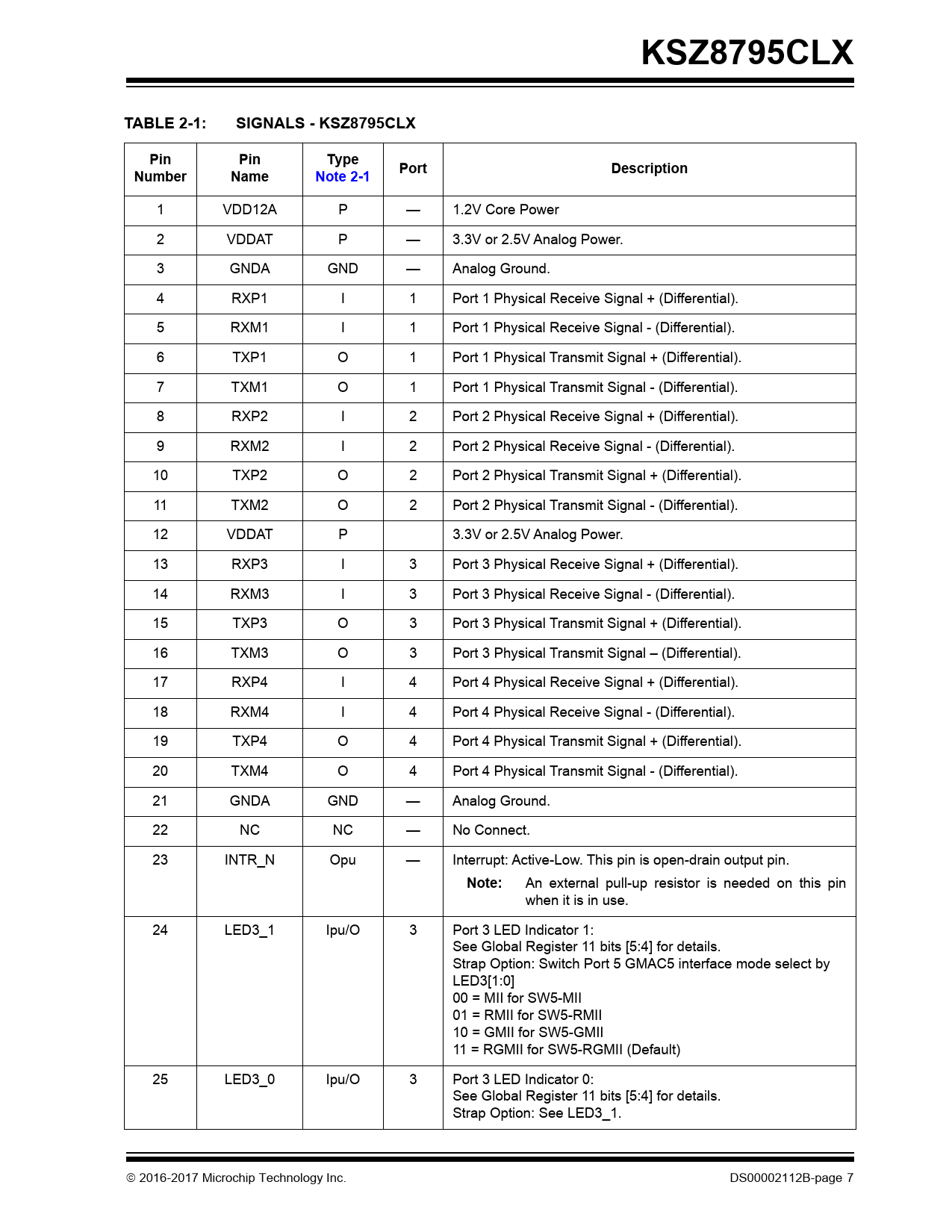 KSZ8795CLX. TABLE 2-1:. SIGNALS - KSZ8795CLX. Pin. Type. Port. Description. Number. Name. Note 2-1. Note: