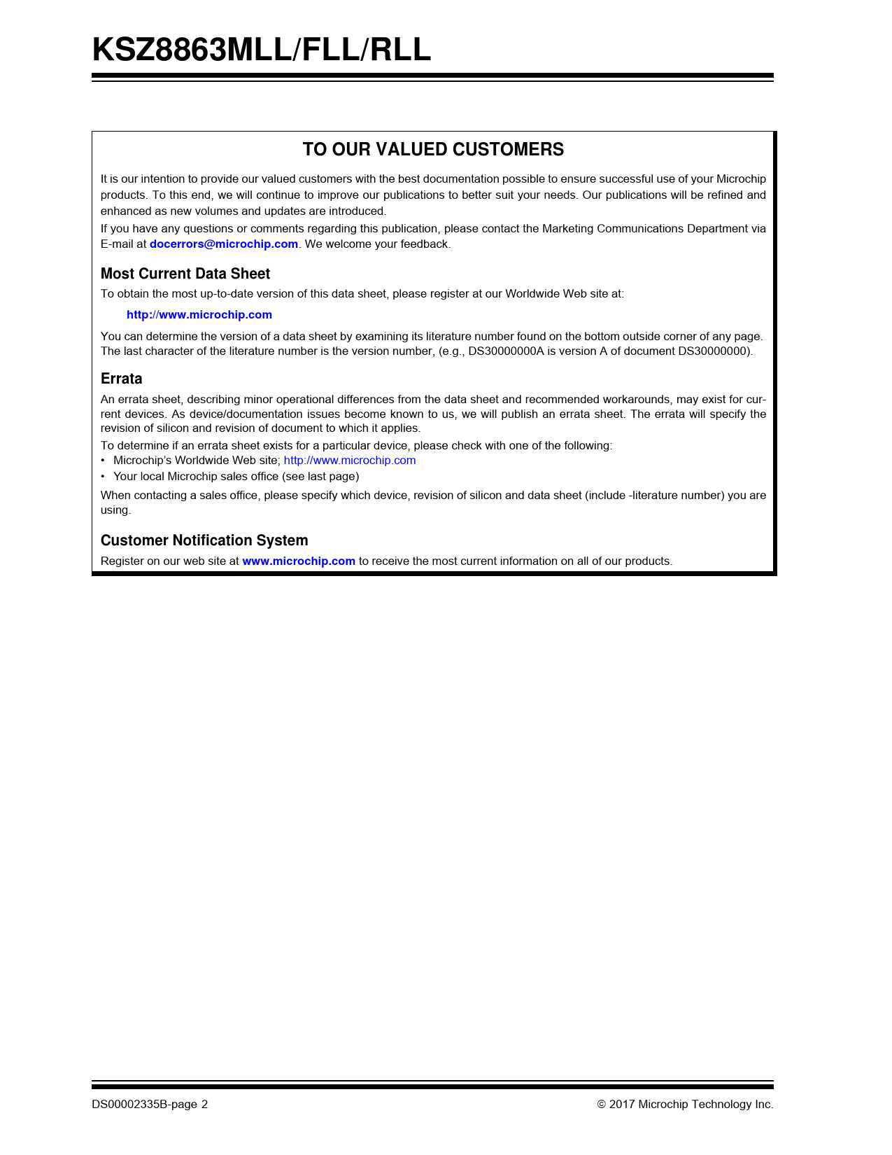 KSZ8863MLL/FLL/RLL. TO OUR VALUED CUSTOMERS. docerrors@microchip.com. Most Current Data Sheet. http://www.microchip.com. Errata