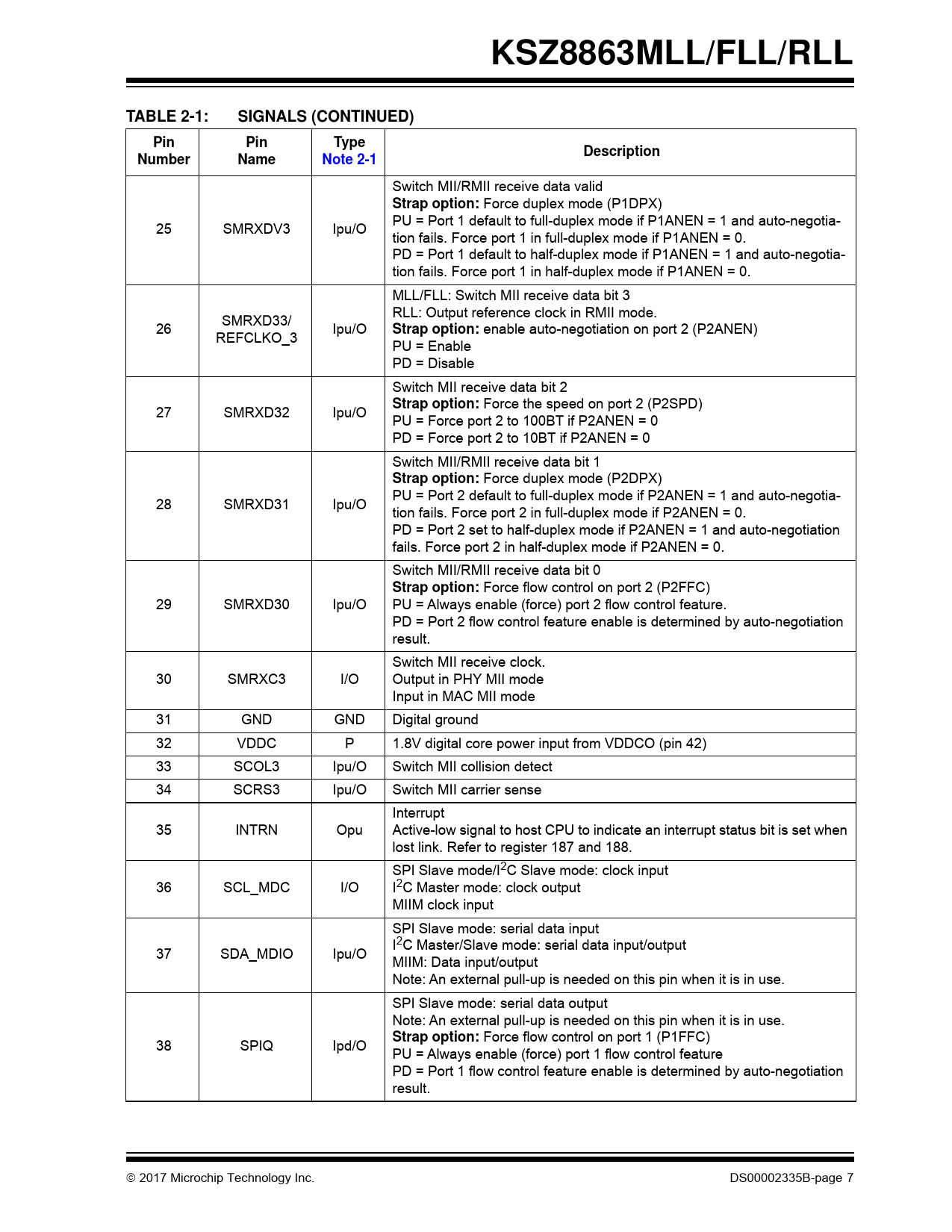 页数 / 页92 / 7 — KSZ8863MLL/FLL/RLL. TABLE 2-1:. SIGNALS (CONTINUED). Pin. Type. …