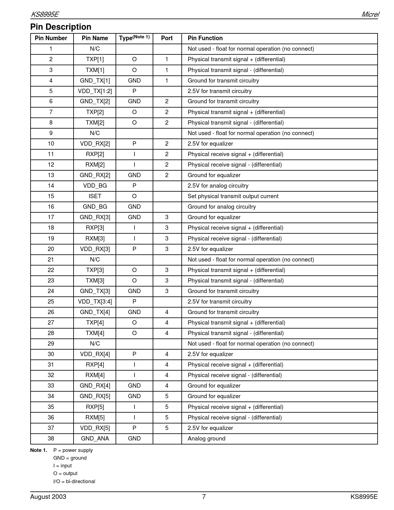 I/O = bi-directional August 2003 7 KS8995E