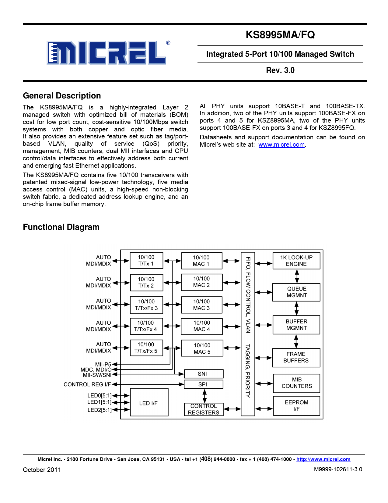 KS8995MA/FQ Integrated 5-Port 10/100 Managed Switch Rev. 3.0 General Description The KS8995MA/FQ is a highly-integrated Layer 2 managed switch with optimized bill of materials (BOM) cost for low port count, cost-sensitive 10/100Mbps switch systems with both copper and optic fiber media. It also provides an extensive feature set such as tag/portbased VLAN, quality of service (QoS) priority, management, MIB counters, dual MII interfaces and CPU control/data interfaces to effectively address both current and emerging fast Ethernet applications. The KS8995MA/FQ contains five 10/100 transceivers with patented mixed-signal low-power technology, five media access control (MAC) units, a high-speed non-blocking switch fabric, a dedicated address lookup engine, and an on-chip frame buffer memory. All PHY units support 10BASE-T and 100BASE-TX. In addition, two of the PHY units support 100BASE-FX on ports 4 and 5 for KSZ8995MA, two of the PHY units support 100BASE-FX on ports 3 and 4 for KSZ8995FQ. Datasheets and support documentation can be found on Micrel’s web site at: www.micrel.com. Functional Diagram Micrel Inc. • 2180 Fortune Drive • San Jose, CA 95131 • USA • tel +1 (408) 944-0800 • fax + 1 (408) 474-1000 • http://www.micrel.com October 2011 M9999-102611-3.0