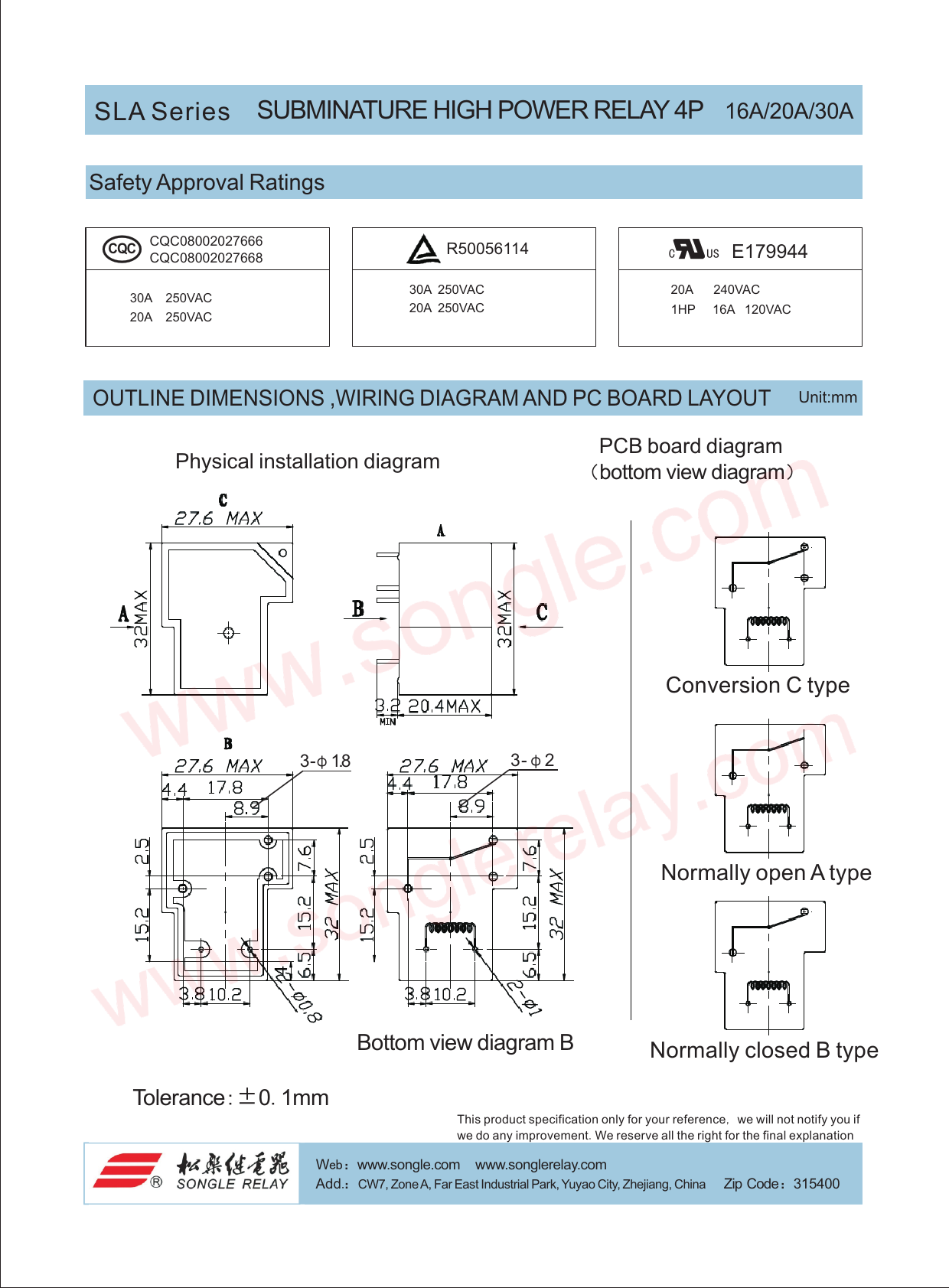 SLA Series SUBMINATURE HIGH POWER RELAY 4P 16A/20A/30A Safety Approval Ratings CQC08002027666 CQC R50056114 C US E179944 CQC08002027668 30A 250VAC 20A 240VAC 30A 250VAC 20A 250VAC 1HP 16A 120VAC 20A 250VAC OUTLINE DIMENSIONS ,WIRING DIAGRAM AND PC BOARD LAYOUT Unit:mm PCB board diagram Physical installation diagram (bottom view diagram) Conversion C type 3-φ1.8 3-φ2 Normally open A type Bottom view diagram B Normally closed B type Tolerance:±0.1mm This product specification only for your reference, we will not notify you if we do any improvement.We reserve all the right for the final explanation Web:www.songle.com www.songlerelay.com Email:sale@songle.com Web:www.songle.com www.songlerelay.com Add.:CW7, Zone A, Far East Industrial Park, Yuyao City, Zhejiang, China i Z p Code:315400 Add.:CW7, Zone A, Far East Industrial Park, Yuyao City, Zhejiang, China Zip Code:315400 Tel.: +86 574 62717777 62762658 62721968 a F x:+86 574 62721978 Document Outline 页 1 页 2