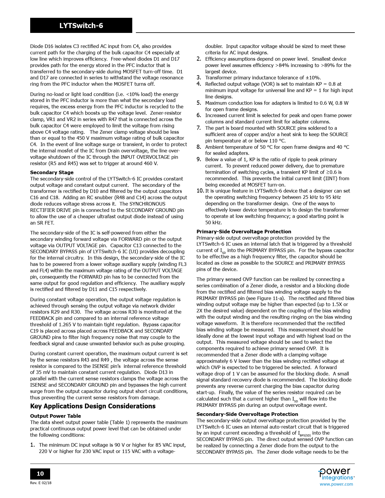 LYTSwitch-6 Diode D16 isolates C3 rectified AC input from C4, also provides doubler. Input capacitor voltage should be sized to meet these current path for the charging of the bulk capacitor C4 especial y at criteria for AC input designs. low line which improves efficiency. Free-wheel diodes D1 and D17 2. Efficiency assumptions depend on power level. Smallest device provides path for the energy stored in the PFC inductor that is power level assumes efficiency >84% increasing to >89% for the transferred to the secondary-side during MOSFET turn-off time. D1 largest device. and D17 are connected in series to withstand the voltage resonance 3. Transformer primary inductance tolerance of ±10%. ring from the PFC inductor when the MOSFET turns off. 4. Reflected output voltage (VOR) is set to maintain KP = 0.8 at minimum input voltage for universal line and KP = 1 for high input During no-load or light load condition (i.e. <10% load) the energy line designs. stored in the PFC inductor is more than what the secondary load 5. Maximum conduction loss for adapters is limited to 0.6 W, 0.8 W requires, the excess energy from the PFC inductor is recycled to the for open frame designs. bulk capacitor C4 which boosts up the voltage level. Zener-resistor 6. Increased current limit is selected for peak and open frame power clamp, VR1 and VR2 in series with R47 that is connected across the columns and standard current limit for adapter columns. bulk capacitor C4 were employed to limit the voltage from rising 7. The part is board mounted with SOURCE pins soldered to a above C4 voltage rating. The Zener clamp voltage should be less sufficient area of copper and/or a heat sink to keep the SOURCE than or equal to the 450 V maximum voltage rating of bulk capacitor pin temperature at or below 110 °C. C4. In the event of line voltage surge or transient, in order to protect 8. Ambient temperature of 50 °C for open frame designs and 40 °C the internal mosfet of the IC from Drain overvoltage, the line over- for sealed adapters. voltage shutdown of the IC through the INPUT OVERVOLTAGE pin 9. Below a value of 1, KP is the ratio of ripple to peak primary resistor (R5 and R45) was set to trigger at around 460 V. current. To prevent reduced power delivery, due to premature Secondary Stage termination of switching cycles, a transient KP limit of ≥0.6 is The secondary-side control of the LYTSwitch-6 IC provides constant recommended. This prevents the initial current limit (IINT) from output voltage and constant output current. The secondary of the being exceeded at MOSFET turn-on. transformer is rectified by D10 and filtered by the output capacitors 10. It is unique feature in LYTSwitch-6 device that a designer can set C16 and C18. Adding an RC snubber (R48 and C14) across the output the operating switching frequency between 25 kHz to 95 kHz diode reduces voltage stress across it. The SYNCHRONOUS depending on the transformer design. One of the ways to RECTIFIER DRIVE pin is connected to the SECONDARY GROUND pin effectively lower device temperature is to design the transformer to al ow the use of a cheaper ultrafast output diode instead of using to operate at low switching frequency; a good starting point is an SR FET. 50 kHz. The secondary-side of the IC is self-powered from either the Primary-Side Overvoltage Protection secondary winding forward voltage via FORWARD pin or the output Primary-side output overvoltage protection provided by the voltage via OUTPUT VOLTAGE pin. Capacitor C13 connected to the LYTSwitch-6 IC uses an internal latch that is triggered by a threshold SECONDARY BYPASS pin of LYTSwitch-6 IC (U1) provides decoupling current of I into the PRIMARY BYPASS pin. For the bypass capacitor SD for the internal circuitry. In this design, the secondary-side of the IC to be effective as a high frequency filter, the capacitor should be has to be powered from a lower voltage auxiliary supply (winding FL3 located as close as possible to the SOURCE and PRIMARY BYPASS and FL4) within the maximum voltage rating of the OUTPUT VOLTAGE pins of the device. pin, consequently the FORWARD pin has to be connected from the The primary sensed OVP function can be realized by connecting a same output for good regulation and efficiency. The auxiliary supply series combination of a Zener diode, a resistor and a blocking diode is rectified and filtered by D11 and C15 respectively. from the rectified and filtered bias winding voltage supply to the During constant voltage operation, the output voltage regulation is PRIMARY BYPASS pin (see Figure 11-a). The rectified and filtered bias achieved through sensing the output voltage via network divider winding output voltage may be higher than expected (up to 1.5X or resistors R29 and R30. The voltage across R30 is monitored at the 2X the desired value) dependent on the coupling of the bias winding FEEDBACK pin and compared to an internal reference voltage with the output winding and the resulting ringing on the bias winding threshold of 1.265 V to maintain tight regulation. Bypass capacitor voltage waveform. It is therefore recommended that the rectified C19 is placed across placed across FEEDBACK and SECONDARY bias winding voltage be measured. This measurement should be GROUND pins to filter high frequency noise that may couple to the ideal y done at the lowest input voltage and with highest load on the feedback signal and cause unwanted behavior such as pulse grouping. output. This measured voltage should be used to select the components required to achieve primary sensed OVP. It is During constant current operation, the maximum output current is set recommended that a Zener diode with a clamping voltage by the sense resistors R43 and R49 , the voltage across the sense approximately 6 V lower than the bias winding rectified voltage at resistor is compared to the ISENSE pin’s internal reference threshold which OVP is expected to be triggered be selected. A forward of 35 mV to maintain