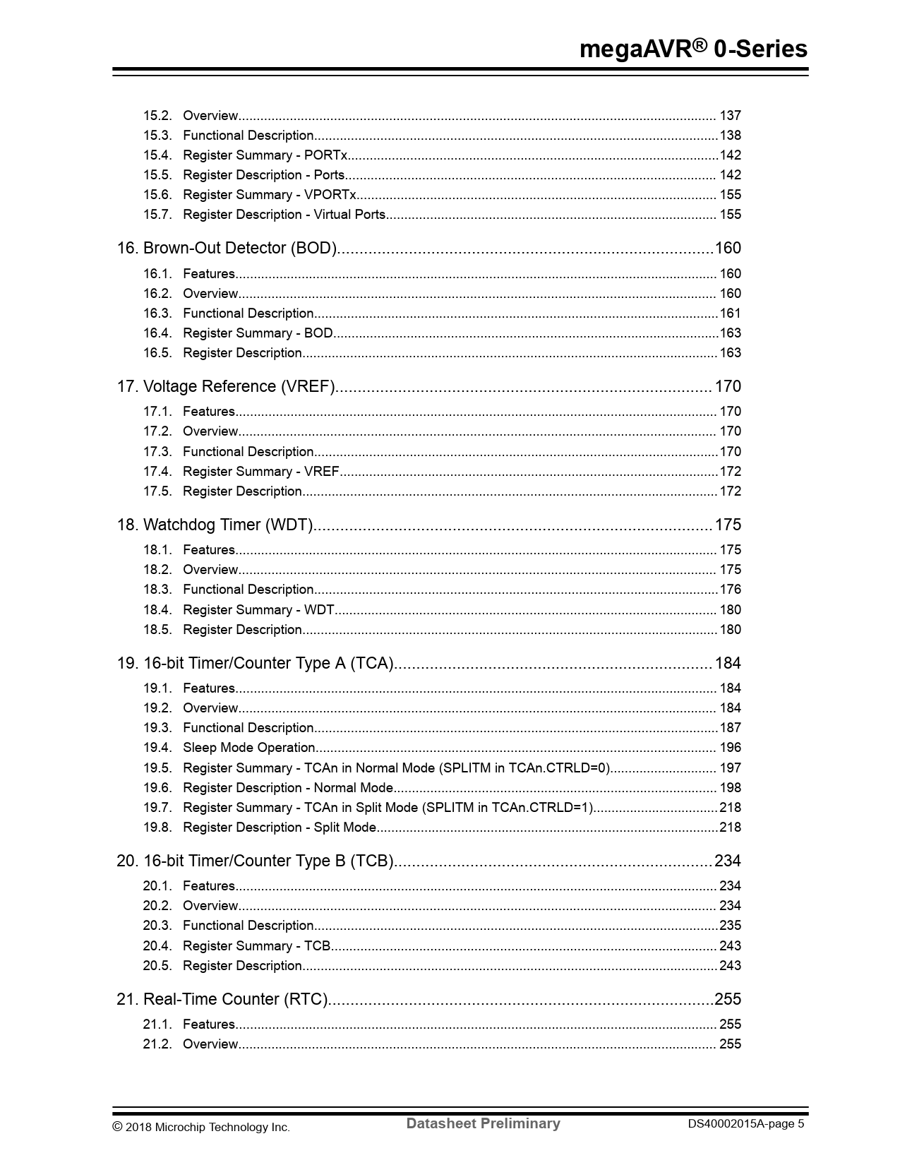 15.2. Overview.. 137 15.3. Functional Description..138 15.4. Register Summary - PORTx...142 15.5. Register Description - Ports... 142 15.6. Register Summary - VPORTx.. 155 15.7. Register Description - Virtual Ports.. 155 16. Brown-Out Detector (BOD)..160 16.1. Features... 160 16.2. Overview.. 160 16.3. Functional Description..161 16.4. Register Summary - BOD...163 16.5. Register Description... 163 17. Voltage Reference (VREF).. 170 17.1. Features... 170 17.2. Overview.. 170 17.3. Functional Description..170 17.4. Register Summary - VREF...172 17.5. Register Description... 172 18. Watchdog Timer (WDT)...175 18.1. Features... 175 18.2. Overview.. 175 18.3. Functional Description..176 18.4. Register Summary - WDT.. 180 18.5. Register Description... 180 19. 16-bit Timer/Counter Type A (TCA)...184 19.1. Features... 184 19.2. Overview.. 184 19.3. Functional Description..187 19.4. Sleep Mode Operation... 196 19.5. Register Summary - TCAn in Normal Mode (SPLITM in TCAn.CTRLD=0)... 197 19.6. Register Description - Normal Mode.. 198 19.7. Register Summary - TCAn in Split Mode (SPLITM in TCAn.CTRLD=1)..218 19.8. Register Description - Split Mode...218 20. 16-bit Timer/Counter Type B (TCB)...234 20.1. Features... 234 20.2. Overview.. 234 20.3. Functional Description..235 20.4. Register Summary - TCB... 243 20.5. Register Description... 243 21. Real-Time Counter (RTC)..255 21.1. Features... 255 21.2. Overview.. 255 © 2018 Microchip Technology Inc.