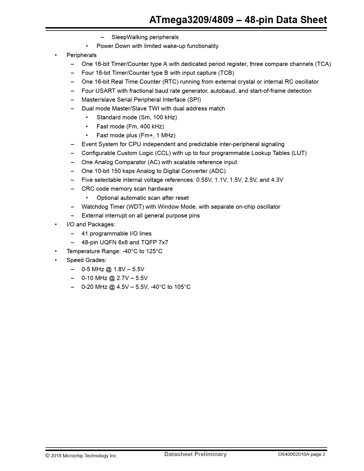 – SleepWalking peripherals • Power Down with limited wake-up functionality • Peripherals – One 16-bit Timer/Counter type A with dedicated period register, three compare channels (TCA) – Four 16-bit Timer/Counter type B with input capture (TCB) – One 16-bit Real Time Counter (RTC) running from external crystal or internal RC oscillator – Four USART with fractional baud rate generator, autobaud, and start-of-frame detection – Master/slave Serial Peripheral Interface (SPI) – Dual mode Master/Slave TWI with dual address match • Standard mode (Sm, 100 kHz) • Fast mode (Fm, 400 kHz) • Fast mode plus (Fm+, 1 MHz) – Event System for CPU independent and predictable inter-peripheral signaling – Configurable Custom Logic (CCL) with up to four programmable Lookup Tables (LUT) – One Analog Comparator (AC) with scalable reference input – One 10-bit 150 ksps Analog to Digital Converter (ADC) – Five selectable internal voltage references: 0.55V, 1.1V, 1.5V, 2.5V, and 4.3V – CRC code memory scan hardware • Optional automatic scan after reset – Watchdog Timer (WDT) with Window Mode, with separate on-chip oscillator – External interrupt on all general purpose pins • I/O and Packages: – 41 programmable I/O lines – 48-pin UQFN 6x6 and TQFP 7x7 • Temperature Range: -40°C to 125°C • Speed Grades: – 0-5 MHz @ 1.8V – 5.5V – 0-10 MHz @ 2.7V – 5.5V – 0-20 MHz @ 4.5V – 5.5V, -40°C to 105°C © 2018 Microchip Technology Inc.