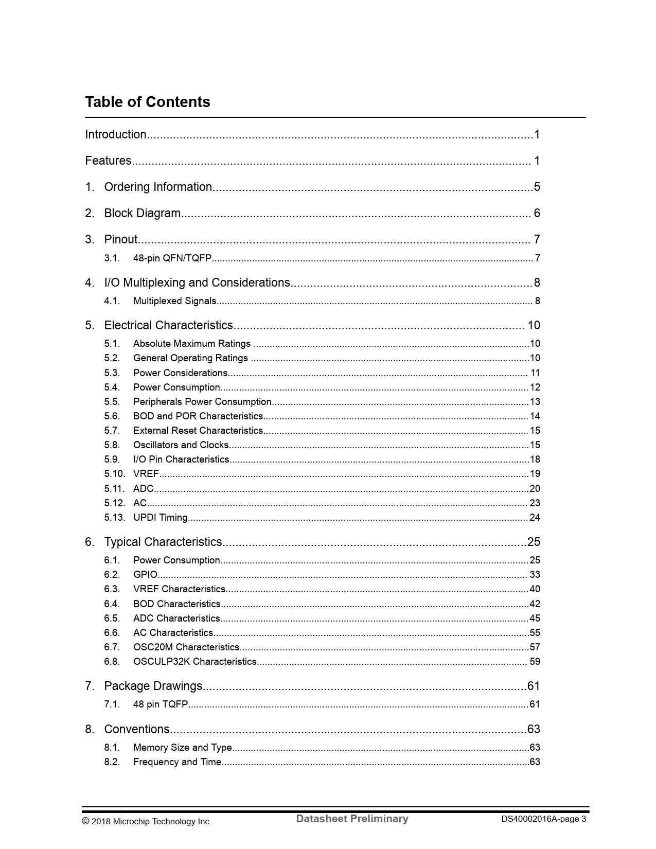 Introduction..1 Features.. 1 1. Ordering Information..5 2. Block Diagram... 6 3. Pinout.. 7 3.1. 48-pin QFN/TQFP.. 7 4. I/O Multiplexing and Considerations..8 4.1. Multiplexed Signals.. 8 5. Electrical Characteristics... 10 5.1. Absolute Maximum Ratings ...10 5.2. General Operating Ratings ..10 5.3. Power Considerations.. 11 5.4. Power Consumption... 12 5.5. Peripherals Power Consumption..13 5.6. BOD and POR Characteristics... 14 5.7. External Reset Characteristics... 15 5.8. Oscillators and Clocks..15 5.9. I/O Pin Characteristics..18 5.10. VREF..19 5.11. ADC..20 5.12. AC.. 23 5.13. UPDI Timing... 24 6. Typical Characteristics...25 6.1. Power Consumption... 25 6.2. GPIO.. 33 6.3. VREF Characteristics... 40 6.4. BOD Characteristics...42 6.5. ADC Characteristics... 45 6.6. AC Characteristics..55 6.7. OSC20M Characteristics..57 6.8. OSCULP32K Characteristics... 59 7. Package Drawings...61 7.1. 48 pin TQFP... 61 8. Conventions...63 8.1. Memory Size and Type...63 8.2. Frequency and Time...63 © 2018 Microchip Technology Inc.