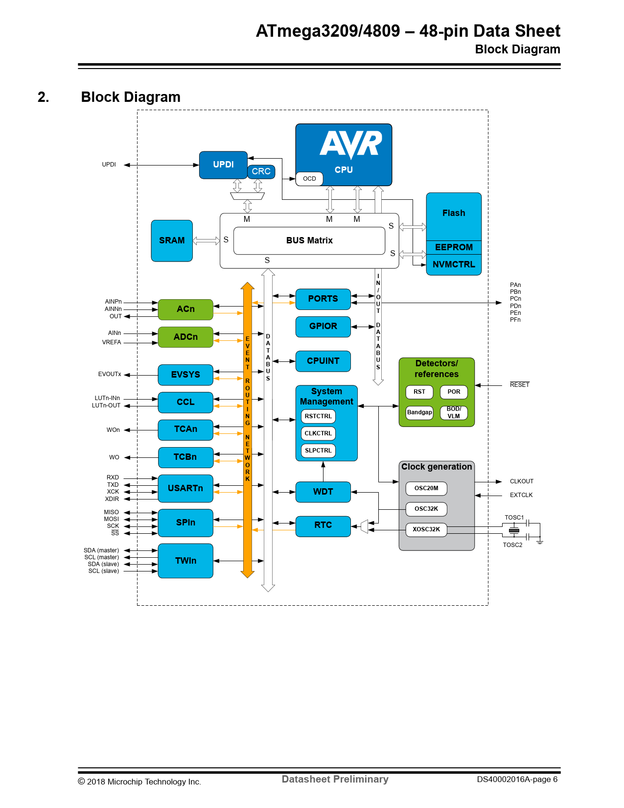 ATmega3209/4809 – 48-pin Data Sheet. Block Diagram. UPDI. CPU. Flash. SRAM. BUS Matrix. EEPROM. NVMCTRL. PORTS. ACn. GPIOR. ADCn. CPUINT