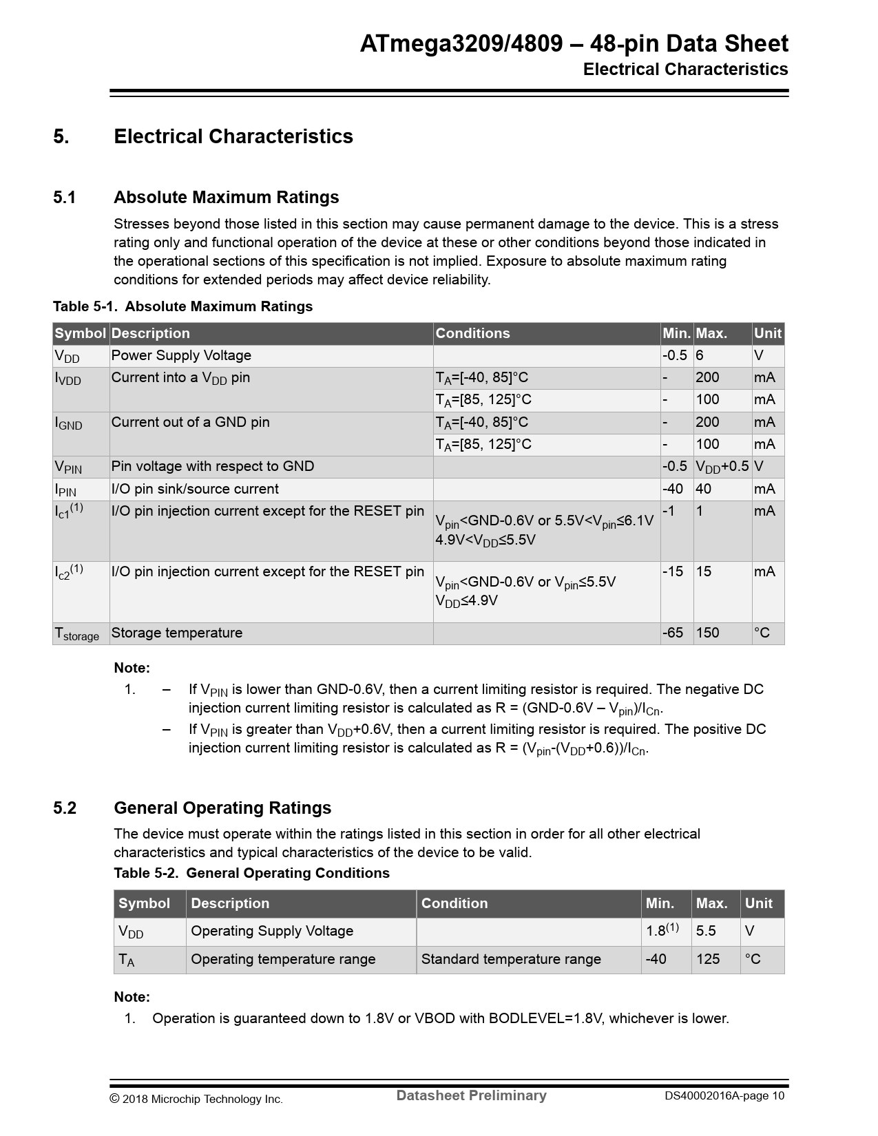 ATmega3209/4809 – 48-pin Data Sheet. Electrical Characteristics. 5.1. Absolute Maximum Ratings