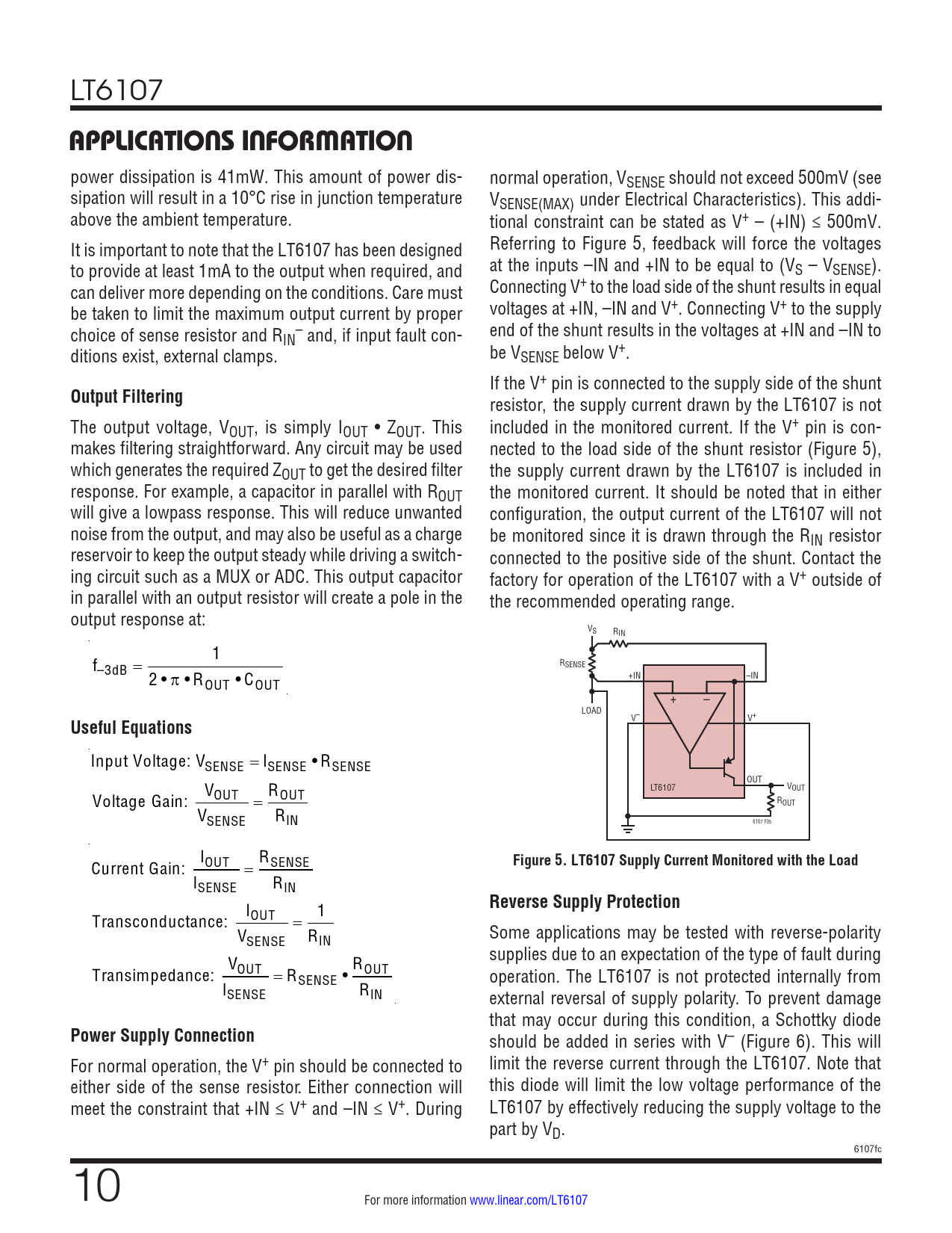 Output Filtering. Useful Equations. Figure 5. LT6107 Supply Current Monitored with the Load. Reverse Supply Protection