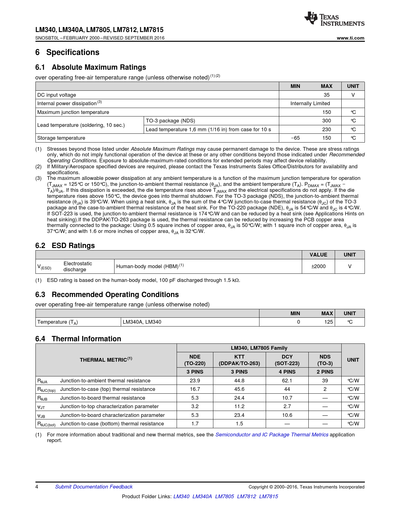 LM340,. LM340A. , LM7805,. LM7812. , LM7815. www.ti.com. 6 Specifications. 6.1 Absolute Maximum Ratings. MIN. MAX. UNIT. 6.2 ESD Ratings. VALUE