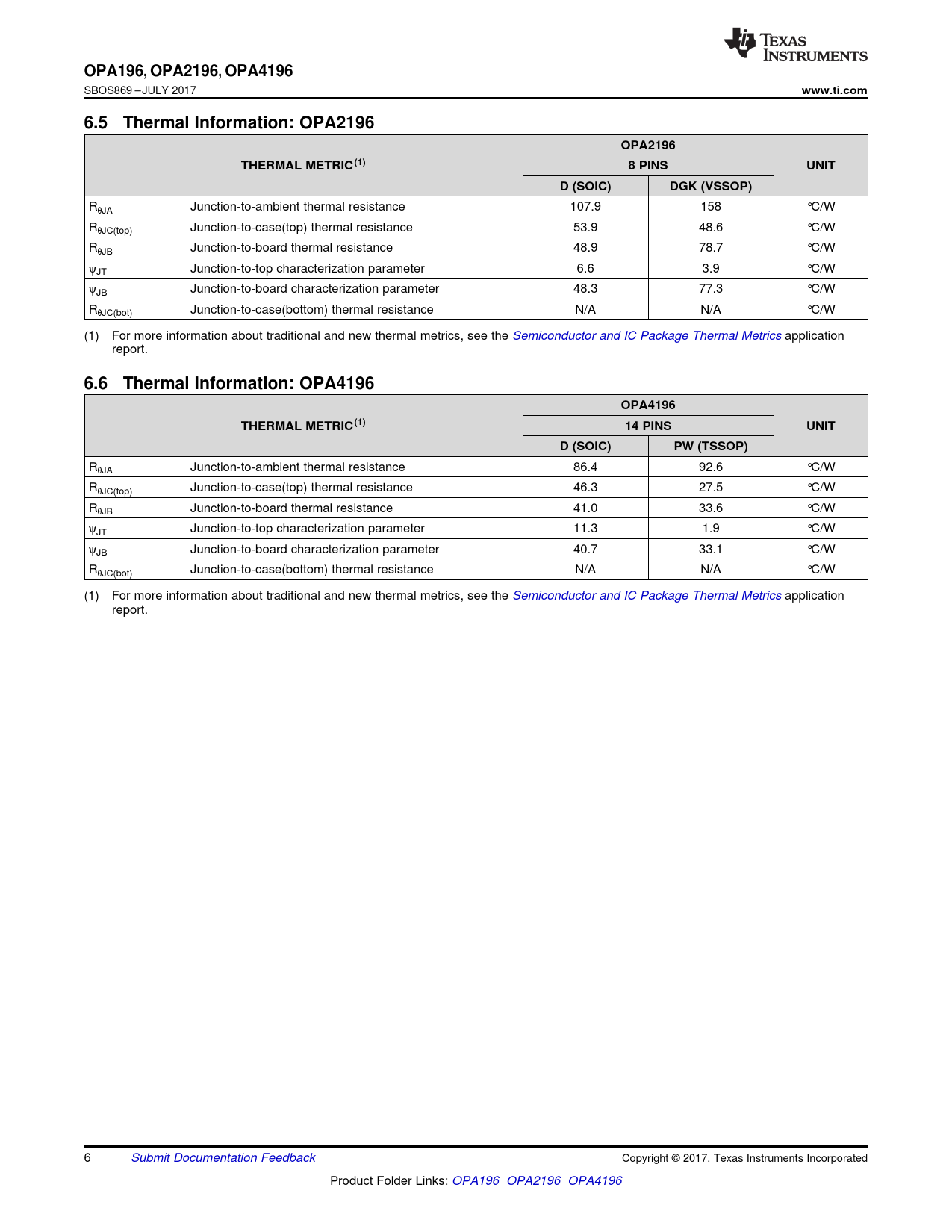 6.6 Thermal Information: OPA4196 OPA4196 THERMAL METRIC(1) 14 PINS UNIT D (SOIC) PW (TSSOP)