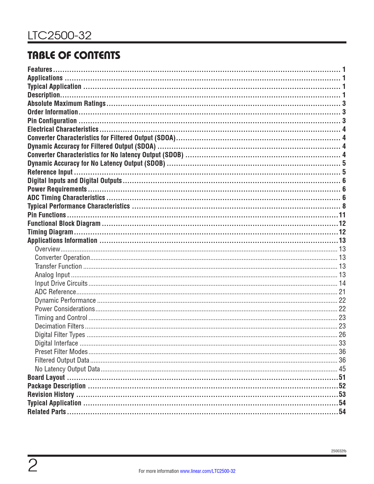 250032fb 2 For more information www.linear.com/LTC2500-32 Document Outline Features Applications Typical Application Description Absolute Maximum Ratings Order Information Pin Configuration Electrical Characteristics Converter Characteristics for Filtered Output (SDOA) Dynamic Accuracy for Filtered Output (SDOA) Converter Characteristics for No latency Output (SDOB) Dynamic Accuracy for No Latency Output (SDOB) Reference Input Digital Inputs and Digital Outputs Power Requirements ADC Timing Characteristics Typical Performance Characteristics Pin Functions Functional Block Diagram Timing Diagram Applications Information Overview Converter Operation Transfer Function Analog Input Input Drive Circuits ADC Reference Dynamic Performance Power Considerations Timing and Control Decimation Filters Digital Filter Types Digital Interface Preset Filter Modes Filtered Output Data No Latency Output Data Board Layout Package Description Revision History Typical Application Related Parts