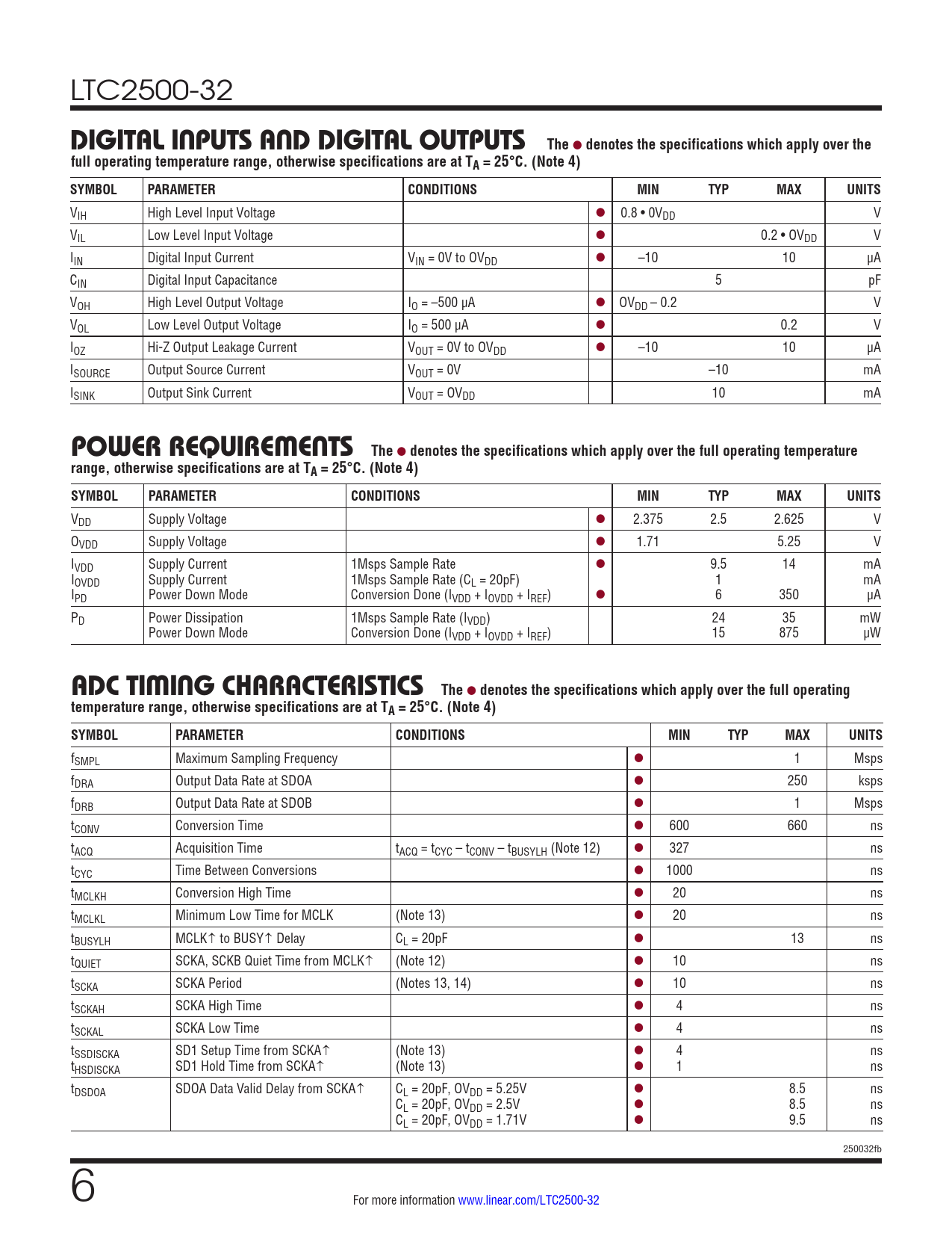 LTC2500-32 DIGITAL INPUTS AND DIGITAL OUTPUTSThe l denotes the specifications which apply over thefull operating temperature range, otherwise specifications are at TA = 25°C. (Note 4)SYMBOLPARAMETERCONDITIONSMINTYPMAXUNITS VIH High Level Input Voltage l 0.8 • 0VDD V VIL Low Level Input Voltage l 0.2 • OVDD V IIN Digital Input Current VIN = 0V to OVDD l –10 10 µA CIN Digital Input Capacitance 5 pF VOH High Level Output Voltage IO = –500 µA l OVDD – 0.2 V VOL Low Level Output Voltage IO = 500 µA l 0.2 V IOZ Hi-Z Output Leakage Current VOUT = 0V to OVDD l –10 10 µA ISOURCE Output Source Current VOUT = 0V –10 mA ISINK Output Sink Current VOUT = OVDD 10 mA POWER REQUIREMENTSThe l denotes the specifications which apply over the full operating temperaturerange, otherwise specifications are at TA = 25°C. (Note 4) SYMBOLPARAMETERCONDITIONSMINTYPMAXUNITS VDD Supply Voltage l 2.375 2.5 2.625 V OVDD Supply Voltage l 1.71 5.25 V IVDD Supply Current 1Msps Sample Rate l 9.5 14 mA IOVDD Supply Current 1Msps Sample Rate (CL = 20pF) 1 mA IPD Power Down Mode Conversion Done (IVDD + IOVDD + IREF) l 6 350 µA PD Power Dissipation 1Msps Sample Rate (IVDD) 24 35 mW Power Down Mode Conversion Done (IVDD + IOVDD + IREF) 15 875 µW ADC TIMING CHARACTERISTICSThe l denotes the specifications which apply over the full operatingtemperature range, otherwise specifications are at TA = 25°C. (Note 4) SYMBOLPARAMETERCONDITIONSMINTYPMAXUNITS fSMPL Maximum Sampling Frequency l 1 Msps fDRA Output Data Rate at SDOA l 250 ksps fDRB Output Data Rate at SDOB l 1 Msps tCONV Conversion Time l 600 660 ns tACQ Acquisition Time tACQ = tCYC – tCONV – tBUSYLH (Note 12) l 327 ns tCYC Time Between Conversions l 1000 ns tMCLKH Conversion High Time l 20 ns tMCLKL Minimum Low Time for MCLK (Note 13) l 20 ns tBUSYLH MCLK to BUSY Delay CL = 20pF l 13 ns tQUIET SCKA, SCKB Quiet Time from MCLK (Note 12) l 10 ns tSCKA SCKA Period (Notes 13, 14) l 10 ns tSCKAH SCKA High Time l 4 ns tSCKAL SCKA Low Time l 4 ns tSSDISCKA SD1 Setup Time from SCKA (Note 13) l 4 ns tHSDISCKA SD1 Hold Time from SCKA (Note 13) l 1 ns tDSDOA SDOA Data Valid Delay from SCKA CL = 20pF, OVDD = 5.25V l 8.5 ns CL = 20pF, OVDD = 2.5V l 8.5 ns CL = 20pF, OVDD = 1.71V l 9.5 ns 250032fb 6 For more information www.linear.com/LTC2500-32 Document Outline Features Applications Typical Application Description Absolute Maximum Ratings Order Information Pin Configuration Electrical Characteristics Converter Characteristics for Filtered Output (SDOA) Dynamic Accuracy for Filtered Output (SDOA) Converter Characteristics for No latency Output (SDOB) Dynamic Accuracy for No Latency Output (SDOB) Reference Input Digital Inputs and Digital Outputs Power Requirements ADC Timing Characteristics Typical Performance Characteristics Pin Functions Functional Block Diagram Timing Diagram Applications Information Overview Converter Operation Transfer Function Analog Input Input Drive Circuits ADC Reference Dynamic Performance Power Considerations Timing and Control Decimation Filters Digital Filter Types Digital Interface Preset Filter Modes Filtered Output Data No Latency Output Data Board Layout Package Description Revision History Typical Application Related Parts
