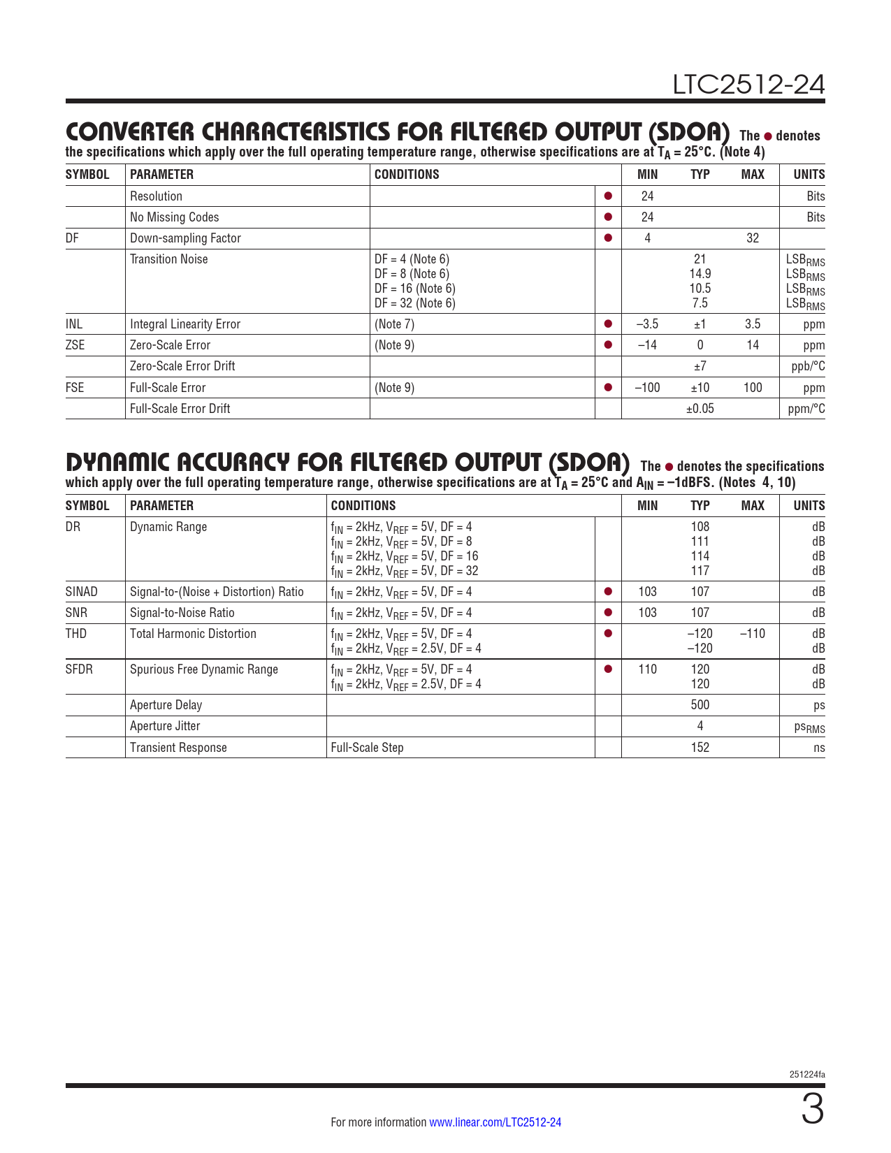 DR Dynamic Range fIN = 2kHz, VREF = 5V, DF = 4 108 dB fIN = 2kHz, VREF = 5V, DF = 8 111 dB fIN = 2kHz, VREF = 5V, DF = 16 114 dB fIN = 2kHz, VREF = 5V, DF = 32 117 dB SINAD Signal-to-(Noise + Distortion) Ratio fIN = 2kHz, VREF = 5V, DF = 4 l 103 107 dB SNR Signal-to-Noise Ratio fIN = 2kHz, VREF = 5V, DF = 4 l 103 107 dB THD Total Harmonic Distortion fIN = 2kHz, VREF = 5V, DF = 4 l –120 –110 dB fIN = 2kHz, VREF = 2.5V, DF = 4 –120 dB SFDR Spurious Free Dynamic Range fIN = 2kHz, VREF = 5V, DF = 4 l 110 120 dB fIN = 2kHz, VREF = 2.5V, DF = 4 120 dB Aperture Delay 500 ps Aperture Jitter 4 psRMS Transient Response Full-Scale Step 152 ns 251224fa For more information www.linear.com/LTC2512-24 3