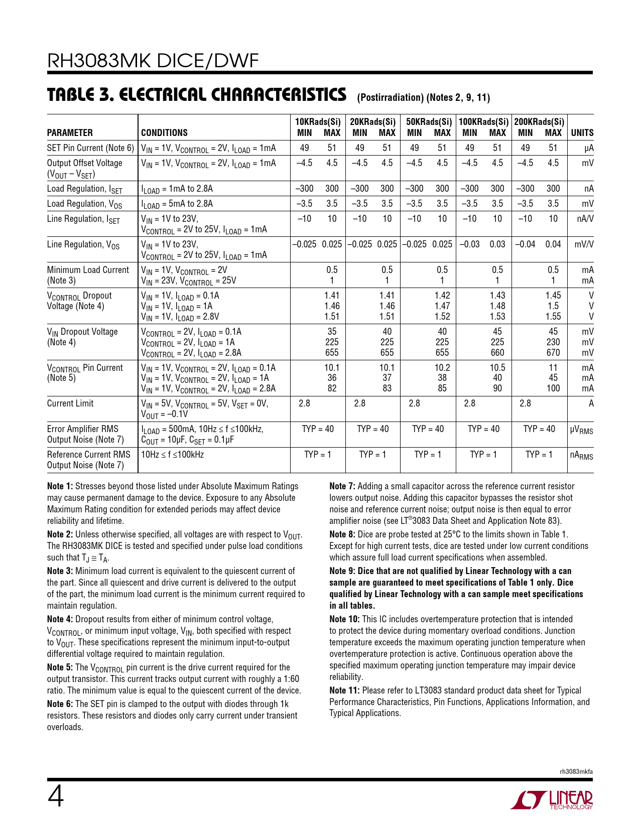 页数 / 页6 / 4 — table 3. electrical characteristics (Postirradiation) (Notes 2, 9, 11)