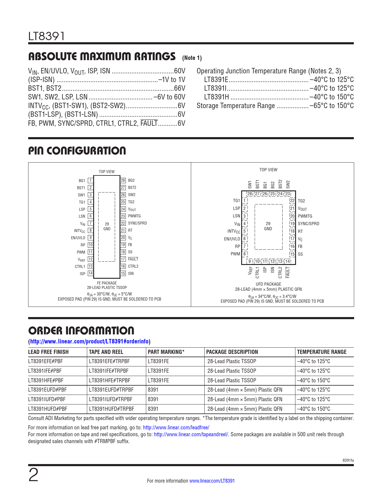 (Note 1). (http://www.linear.com/product/LT8391#orderinfo. ) LEAD FREE FINISH. TAPE AND REEL. PART MARKING*. PACKAGE DESCRIPTION