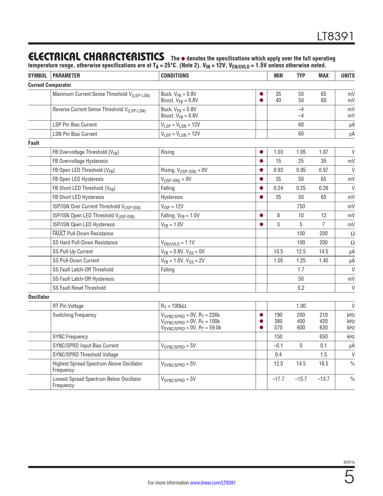 RT Pin Voltage RT = 100kΩ 1.00 V Switching Frequency VSYNC/SPRD = 0V, RT = 226k l 190 200 210 kHz VSYNC/SPRD = 0V, RT = 100k l 380 400 420 kHz VSYNC/SPRD = 0V, RT = 59.0k l 570 600 630 kHz SYNC Frequency 150 650 kHz SYNC/SPRD Input Bias Current VSYNC/SPRD = 5V –0.1 0 0.1 µA SYNC/SPRD Threshold Voltage 0.4 1.5 V Highest Spread Spectrum Above Oscillator VSYNC/SPRD = 5V 12.5 14.5 16.5 % Frequency Lowest Spread Spectrum Below Oscillator VSYNC/SPRD = 5V –17.7 –15.7 –13.7 % Frequency 8391fa For more information www.linear.com/LT8391 5