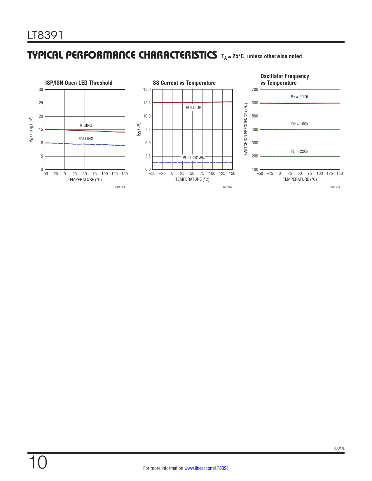 30 15.0 700 RT = 59.0k 25 12.5 600 PULL-UP (kHz) 20 10.0 500 (mV) RISING RT = 100k 15 (µA) 7.5 400 I SS V (ISP-ISN) FALLING 10 5.0 300 RT = 226k 5 2.5 SWITCHING FREQUENCY PULL-DOWN 200 0 0.0 100 –50 –25 0 25 50 75 100 125 150 –50 –25 0 25 50 75 100 125 150 –50 –25 0 25 50 75 100 125 150 TEMPERATURE (°C) TEMPERATURE (°C) TEMPERATURE (°C) 8391 G28 8391 G29 8391 G30 8391fa 10 For more information www.linear.com/LT8391