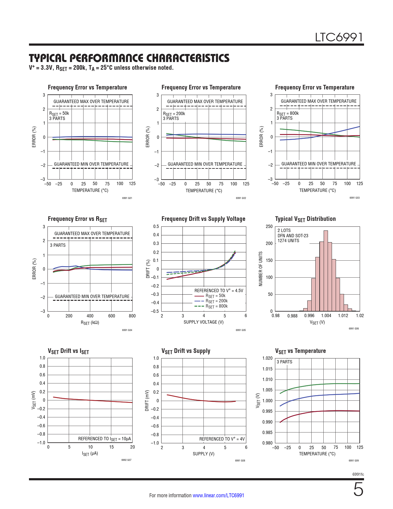 LTC6991 TYPICAL PERFORMANCE CHARACTERISTICSV+ = 3.3V, RSET = 200k, TA = 25°C unless otherwise noted.Frequency Error vs TemperatureFrequency Error vs TemperatureFrequency Error vs Temperature 3 3 3 GUARANTEED MAX OVER TEMPERATURE GUARANTEED MAX OVER TEMPERATURE GUARANTEED MAX OVER TEMPERATURE 2 2 2 RSET = 50k RSET = 200k RSET = 800k 3 PARTS 3 PARTS 3 PARTS 1 1 1 0 0 0 ERROR (%) ERROR (%) ERROR (%) –1 –1 –1 –2 GUARANTEED MIN OVER TEMPERATURE –2 GUARANTEED MIN OVER TEMPERATURE –2 GUARANTEED MIN OVER TEMPERATURE –3 –3 –3 –50 –25 0 25 50 75 100 125 –50 –25 0 25 50 75 100 125 –50 –25 0 25 50 75 100 125 TEMPERATURE (°C) TEMPERATURE (°C) TEMPERATURE (°C) 6991 G01 6991 G02 6991 G03 Frequency Error vs RSETFrequency Drift vs Supply VoltageTypical VSET Distribution 3 0.5 250 2 LOTS GUARANTEED MAX OVER TEMPERATURE 0.4 DFN AND SOT-23 2 0.3 200 1274 UNITS 3 PARTS 0.2 1 0.1 150 0 0 ERROR (%) DRIFT (%) –0.1 100 –1 NUMBER OF UNITS –0.2 REFERENCED TO V+ = 4.5V –0.3 50 –2 GUARANTEED MIN OVER TEMPERATURE RSET = 50k –0.4 RSET = 200k RSET = 800k –3 –0.5 0 0 200 400 600 800 2 3 4 5 6 0.98 0.988 0.996 1.004 1.012 1.02 R SUPPLY VOLTAGE (V) V SET (kΩ) SET (V) 6991 G06 6991 G04 6991 G05 VSET Drift vs ISETVSET Drift vs SupplyVSET vs Temperature 1.0 1.0 1.020 3 PARTS 0.8 0.8 1.015 0.6 0.6 1.010 0.4 0.4 0.2 0.2 1.005 (mV) 0 0 (V) 1.000 V SET –0.2 V SET DRIFT (mV) –0.2 0.995 –0.4 –0.4 0.990 –0.6 –0.6 –0.8 –0.8 0.985 REFERENCED TO ISET = 10µA REFERENCED TO V+ = 4V –1.0 –1.0 0.980 0 5 10 15 20 2 3 4 5 6 –50 –25 0 25 50 75 100 125 ISET (µA) SUPPLY (V) TEMPERATURE (°C) 6992 G07 6991 G08 6991 G09 6991fc For more information www.linear.com/LTC6991 5 Document Outline Features Applications Typical Application Description Absolute Maximum Ratings Pin Configuration Order Information Electrical Characteristics Typical Performance Characteristics Pin Functions Block Diagram Operation Applications Information Typical Applications Package Description Revision History Typical Application Related Parts