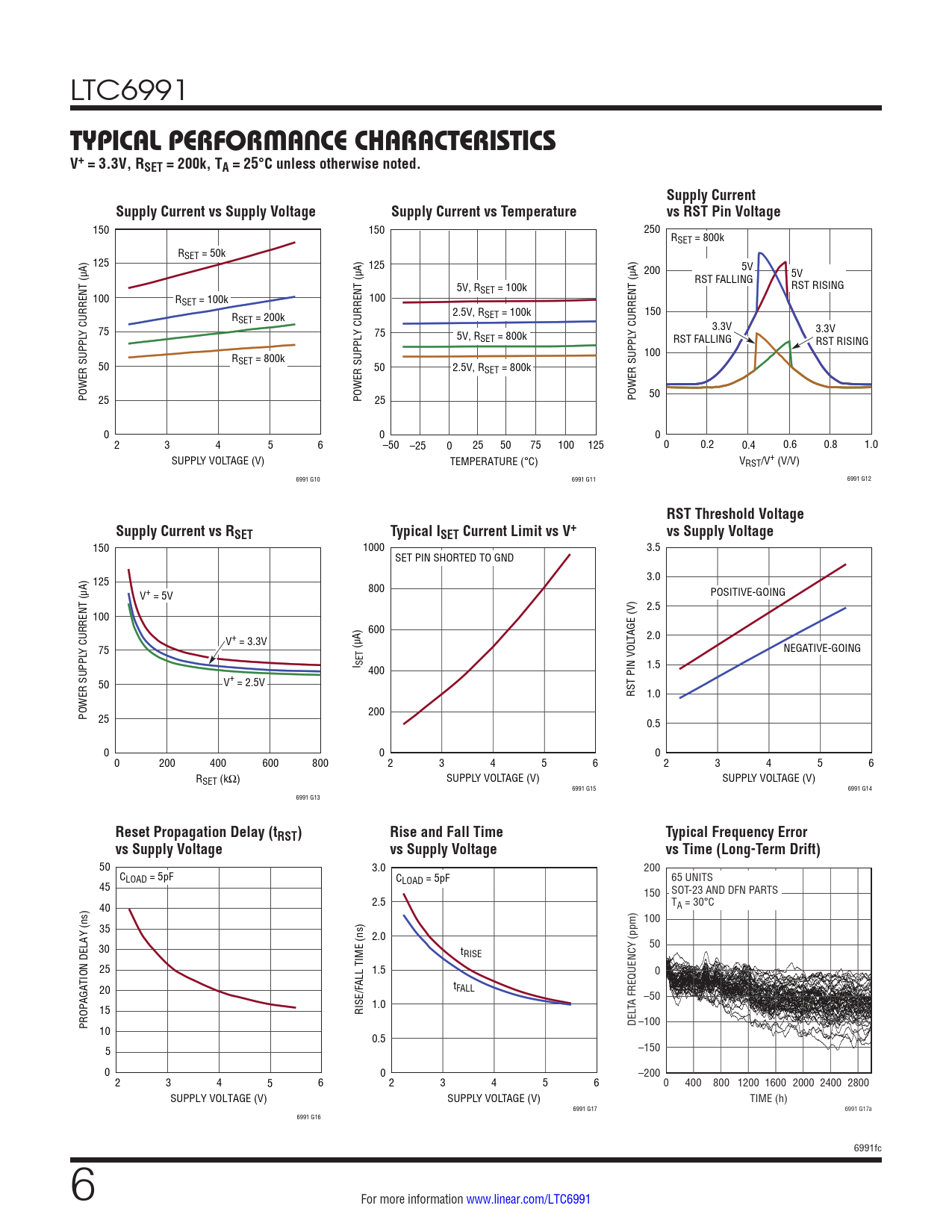 150 1000 3.5 SET PIN SHORTED TO GND 125 3.0 800 V+ = 5V POSITIVE-GOING 2.5 100 600 V+ = 3.3V TAGE (V) 2.0 Y CURRENT (µA) 75 (µA) NEGATIVE-GOING I SET 400 1.5 50 V+ = 2.5V RST PIN VOL 1.0 POWER SUPPL 200 25 0.5 0 0 0 0 200 400 600 800 2 3 4 5 6 2 3 4 5 6 RSET (kΩ) SUPPLY VOLTAGE (V) SUPPLY VOLTAGE (V) 6991 G15 6991 G14 6991 G13
