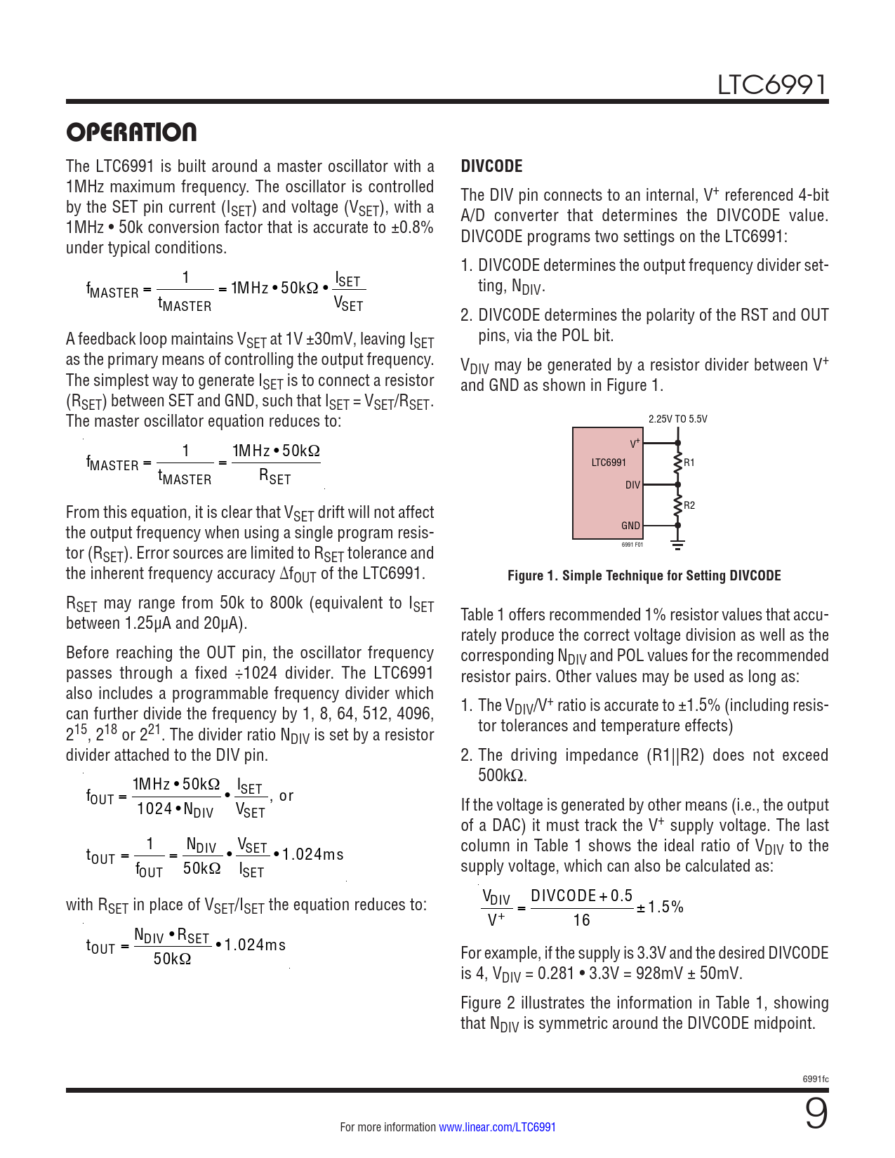 1MHz maximum frequency. The oscillator is controlled The DIV pin connects to an internal, V+ referenced 4-bit by the SET pin current (ISET) and voltage (VSET), with a A/D converter that determines the DIVCODE value. 1MHz • 50k conversion factor that is accurate to ±0.8% DIVCODE programs two settings on the LTC6991: under typical conditions. 1. DIVCODE determines the output frequency divider set- 1 I f SET MASTER = = 1MHz • 50kΩ • ting, NDIV . tMASTER VSET 2. DIVCODE determines the polarity of the RST and OUT A feedback loop maintains VSET at 1V ±30mV, leaving ISET pins, via the POL bit. as the primary means of controlling the output frequency. V The simplest way to generate I DIV may be generated by a resistor divider between V+ SET is to connect a resistor and GND as shown in Figure 1. (RSET) between SET and GND, such that ISET = VSET/RSET . The master oscillator equation reduces to: 2.25V TO 5.5V 1 1MHz • 50k V+ f Ω MASTER = = LTC6991 R1 tMASTER RSET DIV From this equation, it is clear that V R2 SET drift will not affect the output frequency when using a single program resis- GND tor (R 6991 F01 SET). Error sources are limited to RSET tolerance and the inherent frequency accuracy ∆fOUT of the LTC6991.