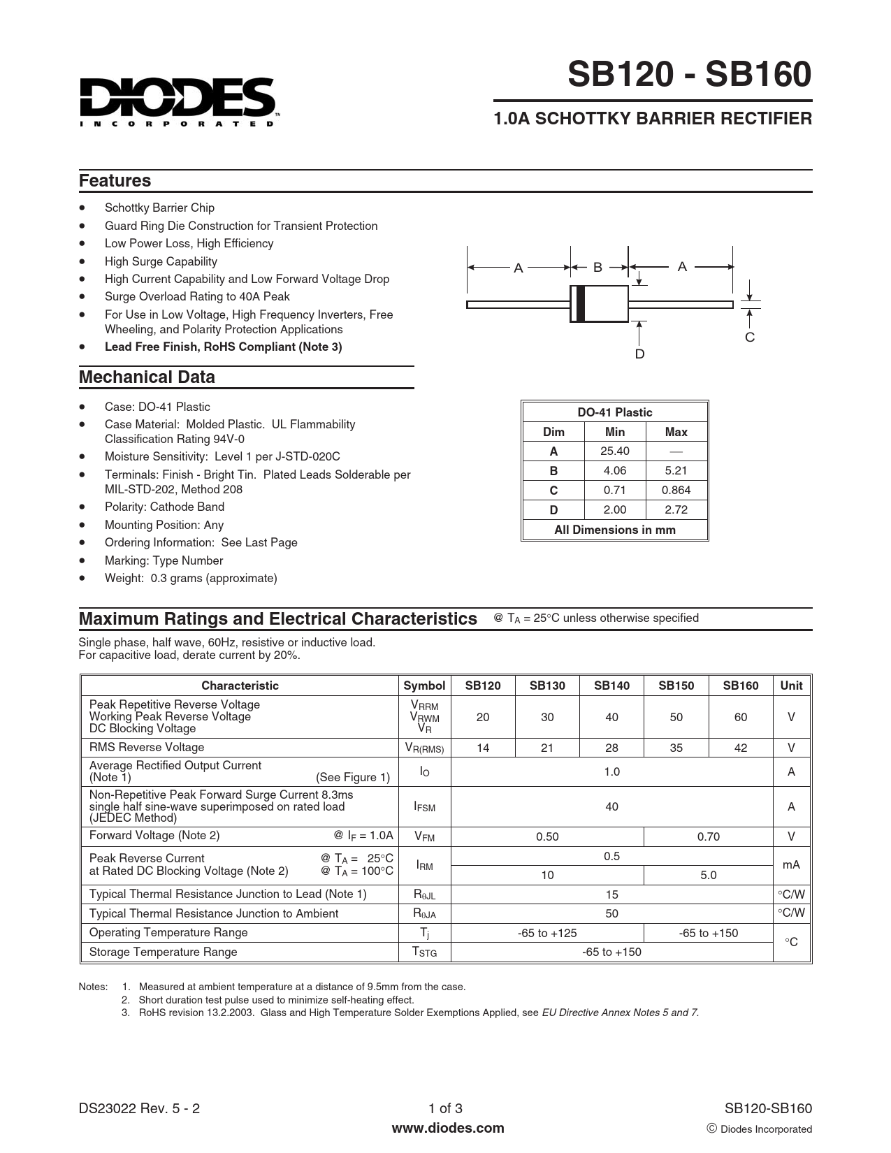 SB120 - SB1601.0A SCHOTTKY BARRIER RECTIFIERFeatures · Schottky Barrier Chip · Guard Ring Die Construction for Transient Protection · Low Power Loss, High Efficiency · High Surge Capability A B A · High Current Capability and Low Forward Voltage Drop · Surge Overload Rating to 40A Peak · For Use in Low Voltage, High Frequency Inverters, Free Wheeling, and Polarity Protection Applications C · Lead Free Finish, RoHS Compliant (Note 3) D Mechanical Data · Case: DO-41 Plastic DO-41 Plastic · Case Material: Molded Plastic. UL Flammability DimMinMax Classification Rating 94V-0 A 25.40 ¾ · Moisture Sensitivity: Level 1 per J-STD-020C B 4.06 5.21 · Terminals: Finish - Bright Tin. Plated Leads Solderable per MIL-STD-202, Method 208 C 0.71 0.864 · Polarity: Cathode Band D 2.00 2.72 · Mounting Position: Any All Dimensions in mm · Ordering Information: See Last Page · Marking: Type Number · Weight: 0.3 grams (approximate) Maximum Ratings and Electrical Characteristics @ TA = 25°C unless otherwise specified Single phase, half wave, 60Hz, resistive or inductive load. For capacitive load, derate current by 20%. CharacteristicSymbolSB120SB130SB140SB150SB160Unit Peak Repetitive Reverse Voltage VRRM Working Peak Reverse Voltage VRWM 20 30 40 50 60 V DC Blocking Voltage VR RMS Reverse Voltage VR(RMS) 14 21 28 35 42 V Average Rectified Output Current I (Note 1) (See Figure 1) O 1.0 A Non-Repetitive Peak Forward Surge Current 8.3ms single half sine-wave superimposed on rated load IFSM 40 A (JEDEC Method) Forward Voltage (Note 2) @ IF = 1.0A VFM 0.50 0.70 V Peak Reverse Current @ T 0.5 A = 25°C I mA at Rated DC Blocking Voltage (Note 2) @ T RM A = 100°C 10 5.0 Typical Thermal Resistance Junction to Lead (Note 1) RqJL 15 °C/W Typical Thermal Resistance Junction to Ambient RqJA 50 °C/W Operating Temperature Range Tj -65 to +125 -65 to +150 °C Storage Temperature Range TSTG -65 to +150 Notes: 1. Measured at ambient temperature at a distance of 9.5mm from the case. 2. Short duration test pulse used to minimize self-heating effect. 3. RoHS revision 13.2.2003. Glass and High Temperature Solder Exemptions Applied, see EU Directive Annex Notes 5 and 7. DS23022 Rev. 5 - 2 1 of 3 SB120-SB160 www.diodes.comã Diodes Incorporated
