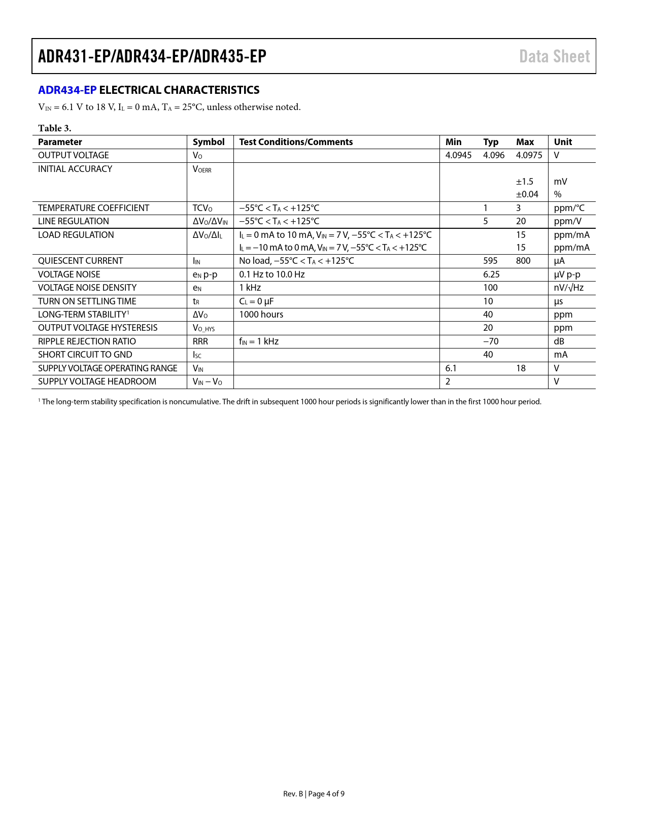 ADR431-EP/ADR434-EP/ADR435-EP Data Sheet ADR434-EP E LECTRICAL CHARACTERISTICS Table 3 Parameter Symbol