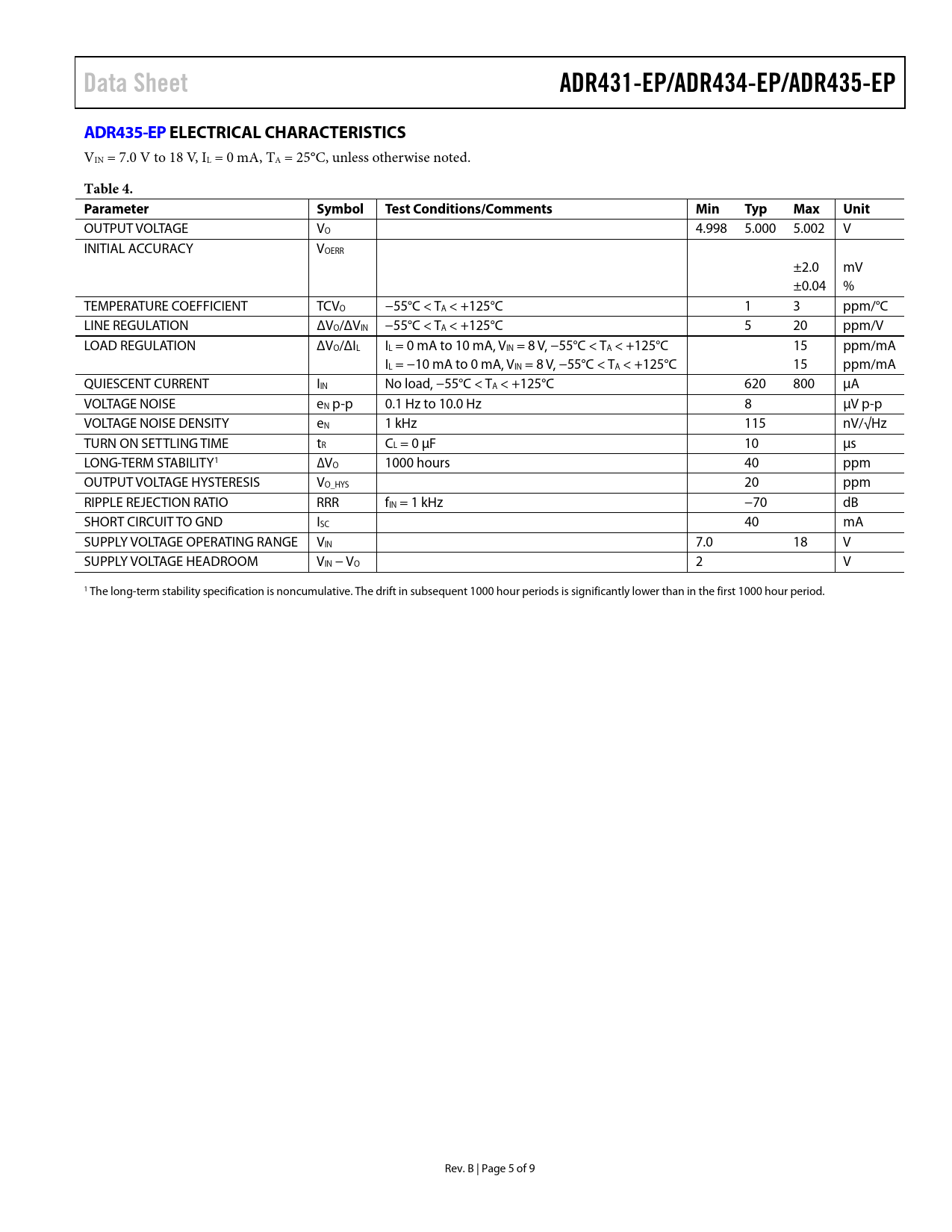 Data Sheet. ADR431-EP/ADR434-EP/ADR435-EP. ADR435-EP E. LECTRICAL CHARACTERISTICS. Table 4. Parameter. Symbol