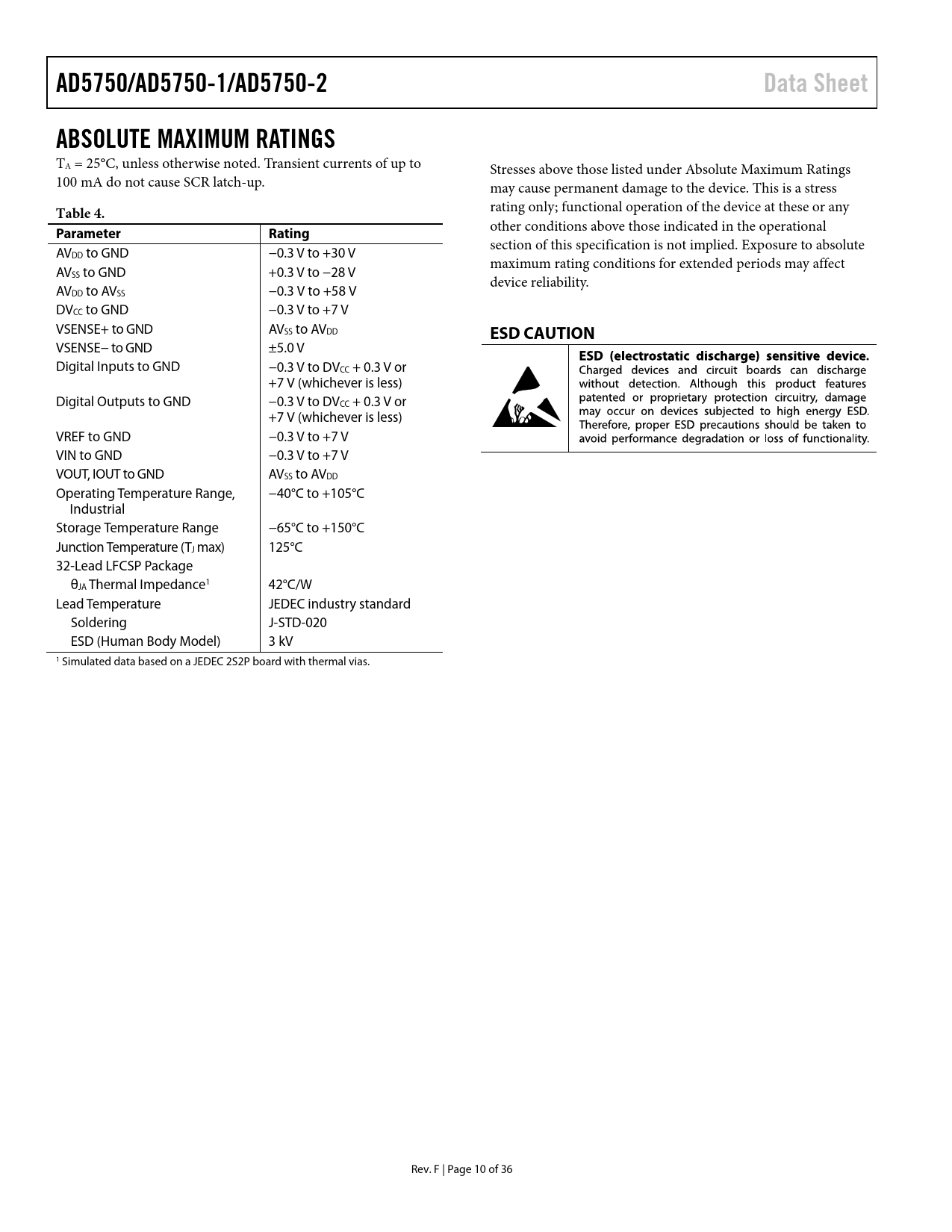 link to page 10 AD5750/AD5750-1/AD5750-2Data SheetABSOLUTE MAXIMUM RATINGS TA = 25°C, unless otherwise noted. Transient currents of up to Stresses above those listed under Absolute Maximum Ratings 100 mA do not cause SCR latch-up. may cause permanent damage to the device. This is a stress Table 4. rating only; functional operation of the device at these or any ParameterRating other conditions above those indicated in the operational section of this specification is not implied. Exposure to absolute AVDD to GND −0.3 V to +30 V maximum rating conditions for extended periods may affect AVSS to GND +0.3 V to −28 V device reliability. AVDD to AVSS −0.3 V to +58 V DVCC to GND −0.3 V to +7 V VSENSE+ to GND AVSS to AVDD ESD CAUTION VSENSE− to GND ±5.0 V Digital Inputs to GND −0.3 V to DVCC + 0.3 V or +7 V (whichever is less) Digital Outputs to GND −0.3 V to DVCC + 0.3 V or +7 V (whichever is less) VREF to GND −0.3 V to +7 V VIN to GND −0.3 V to +7 V VOUT, IOUT to GND AV SS to AVDD Operating Temperature Range, −40°C to +105°C Industrial Storage Temperature Range −65°C to +150°C Junction Temperature (TJ max) 125°C 32-Lead LFCSP Package θJA Thermal Impedance1 42°C/W Lead Temperature JEDEC industry standard Soldering J-STD-020 ESD (Human Body Model) 3 kV 1 Simulated data based on a JEDEC 2S2P board with thermal vias. Rev. F | Page 10 of 36 Document Outline Features Applications General Description Table of Contents Revision History Functional Block Diagram Specifications Timing Characteristics Timing Diagrams Absolute Maximum Ratings ESD Caution Pin Configuration and Function Descriptions Typical Performance Characteristics Voltage Output Current Output Terminology Theory of Operation Software Mode Current Output Architecture Driving Inductive Loads Voltage Output Amplifier Driving Large Capacitive Loads Power-On State of AD5750/AD5750-1/AD5750-2 Default Registers at Power-On Reset Function OUTEN Software Control Input Shift Register Status Bit Read Operation Hardware Control Transfer Function Detailed Description of Features Output Fault Alert—Software Mode Output Fault Alert—Hardware Mode Voltage Output Short-Circuit Protection Asynchronous Clear (CLEAR) External Current Setting Resistor Programmable Overrange Modes Packet Error Checking Applications Information Transient Voltage Protection Thermal Considerations Layout Guidelines Galvanically Isolated Interface Microprocessor Interfacing Outline Dimensions Ordering Guide