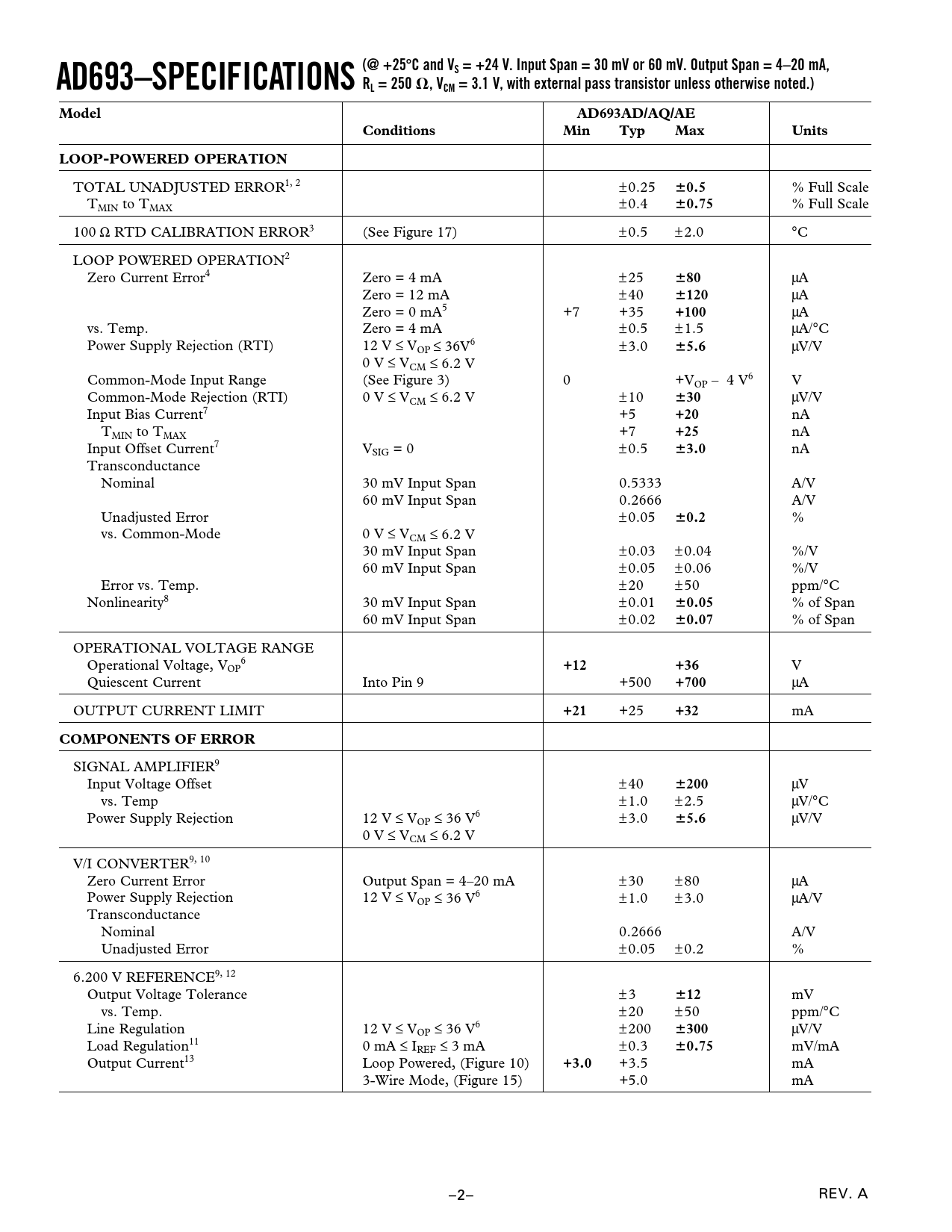 AD693–SPECIFICATIONS (@ +25. C and VS = +24 V. Input Span = 30 mV or 60 mV. Output Span = 4–20 mA,. RL = 250