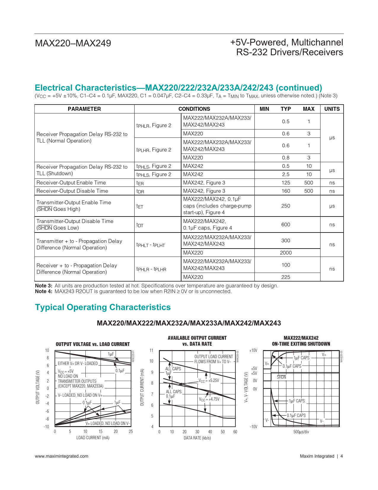 Electrical Characteristics—MAX220/222/232A/233A/242/243 (continued). PARAMETER CONDITIONS. MIN. TYP. MAX. UNITS. Note 3:. Note 4: