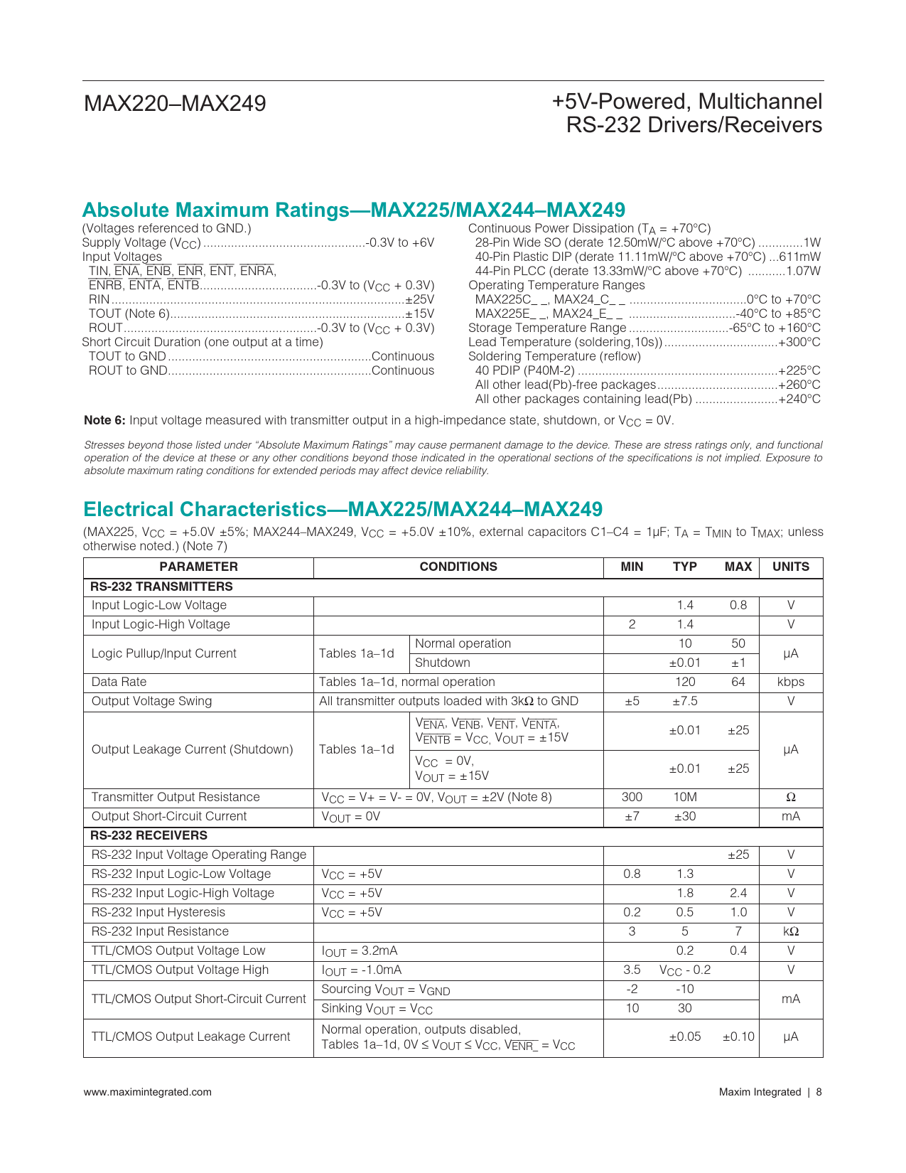 Absolute Maximum Ratings—MAX225/MAX244–MAX249. Note 6:. Electrical Characteristics—MAX225/MAX244–MAX249. PARAMETER. CONDITIONS