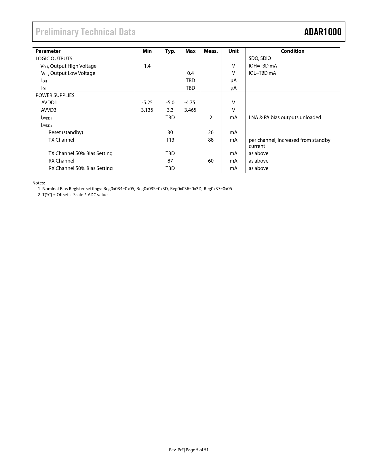 页数 / 页51 / 5 — Preliminary Technical Data. ADAR1000. Parameter. Min. Typ. Max. Meas. …