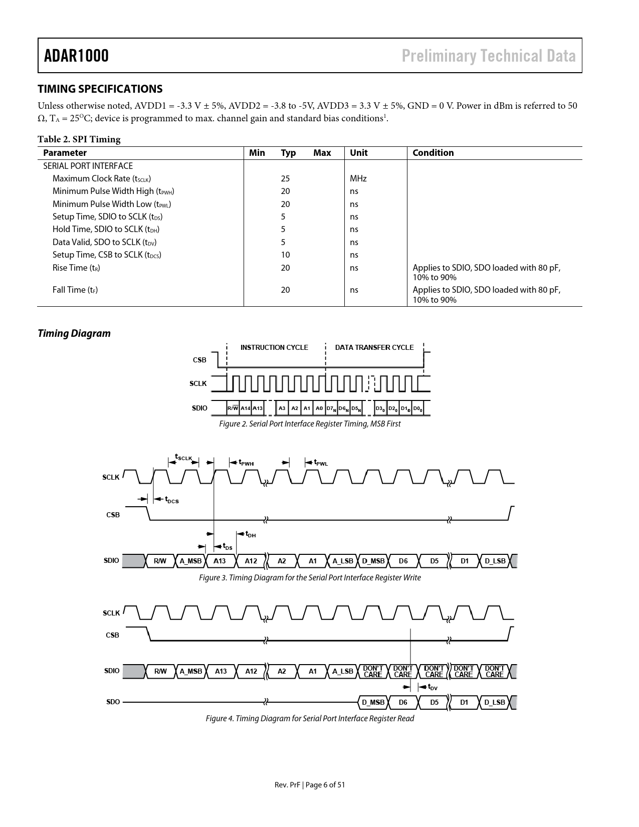 页数 / 页51 / 6 — ADAR1000. Preliminary Technical Data. TIMING SPECIFICATIONS. Table 2. SPI …