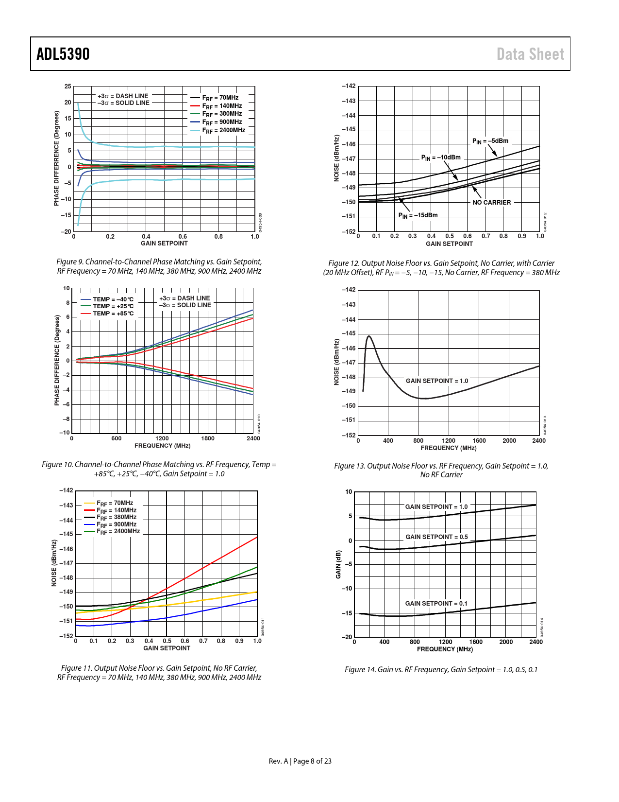 Figure 9. Channel-to-Channel Phase Matching vs. Gain Setpoint, Figure 12. Output Noise Floor vs. Gain Setpoint, No Carrier, with Carrier RF Frequency = 70 MHz, 140 MHz, 380 MHz, 900 MHz, 2400 MHz (20 MHz Offset), RF PIN = −5, −10, −15, No Carrier, RF Frequency = 380 MHz
