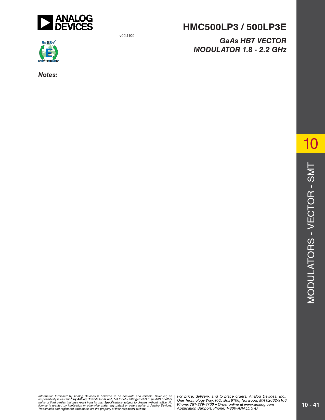 HMC500LP3 / 500LP3E v02.1109 GaAs HBT VECTORMODULATOR 1.8 - 2.2 GHzNotes: 10 T - SM R O T C E - V S R O T A L U MOD Information furnishe F d obr pr y An i al c o e g ,D d evi e ce lis vie s r beyli, a eve n d t d to p o be acclac urat e o e an r d d releiars ble , p . Hole we a vesr, en c o For price, delivery, and to place orders: Analog Devices, Inc., responsibility is assumed by Analog Devices for its use, nor for any infringements of patents or other ontact Hittite Microwave Corporation: One Technology Way, P.O. Box 9106, Norwood, MA 02062-9106 20 Alpha Road, Chelmsford, MA 01824 Phone rights of third parties that may result from its use. Specifications subject to change without notice. No : 9P7h8 o - n 25 e: 7 0- 81 3 - 3 2 4 9- 3 F 470 ax: 9 0 • Ord 7 e 8 r o -n25 lin 0- e a 3 t 373 license is granted by implication or otherwise under any patent or patent rights of Analog Devices. www.analog.com 10 - 41 Order On Trademarks and registered trademarks are the property of their respective owners. -line at www.hi A tt p ipte lic .c ati o o m n Support: Phone: 1-800-ANALOG-D