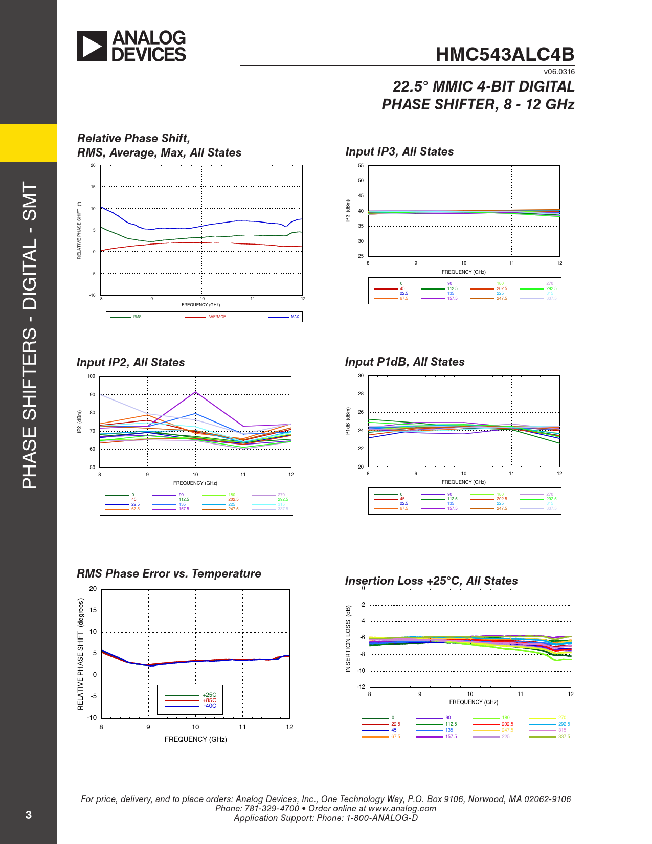 HMC543ALC4B v06.0316 22.5° MMIC 4-BIT DIGITALPHASE SHIFTER, 8 - 12 GHzRelative Phase Shift, RMS, Average, Max, All StatesInput IP3, All States 20 55 T 50 15 M 45 ) m (°) B 10 T d 40 IF ( 3 SH IP 35 ASE 5 L - S PH 30 IVE AT 0 EL 25 R ITA 8 9 10 11 12 FREQUENCY (GHz) -5 IG 0 90 180 270 45 112.5 202.5 292.5 22.5 135 225 315 -10 67.5 157.5 247.5 337.5 8 9 10 11 12 FREQUENCY (GHz) RMS AVERAGE MAX S - D R E T Input IP2, All StatesInput P1dB, All States 30 IF 100 H 90 28 ) 80 m m 26 B d E S (dB ( 2 70 1dB 24 IP S P A 60 22 H 50 20 P 8 9 10 11 12 8 9 10 11 12 FREQUENCY (GHz) FREQUENCY (GHz) 0 90 180 270 0 90 180 270 45 112.5 202.5 292.5 45 112.5 202.5 292.5 22.5 135 225 315 22.5 135 225 315 67.5 157.5 247.5 337.5 67.5 157.5 247.5 337.5 RMS Phase Error vs. TemperatureInsertion Loss +25°C, All States 20 0 ) s e ) -2 15 re B g d e ( S -4 (d S T 10 O IF L -6 N SH IO 5 T -8 R E ASE S PH IN -10 0 IVE -12 AT -5 +25C 8 9 10 11 12 +85C EL FREQUENCY (GHz) -40C R -10 0 90 180 270 22.5 112.5 202.5 292.5 8 9 10 11 12 45 135 247.5 315 FREQUENCY (GHz) 67.5 157.5 225 337.5 For price, delivery, and to place orders: Analog Devices, Inc., One Technology Way, P.O. Box 9106, Norwood, MA 02062-9106 Phone: 781-329-4700 • Order online at www.analog.com 3 Application Support: Phone: 1-800-ANALOG-D