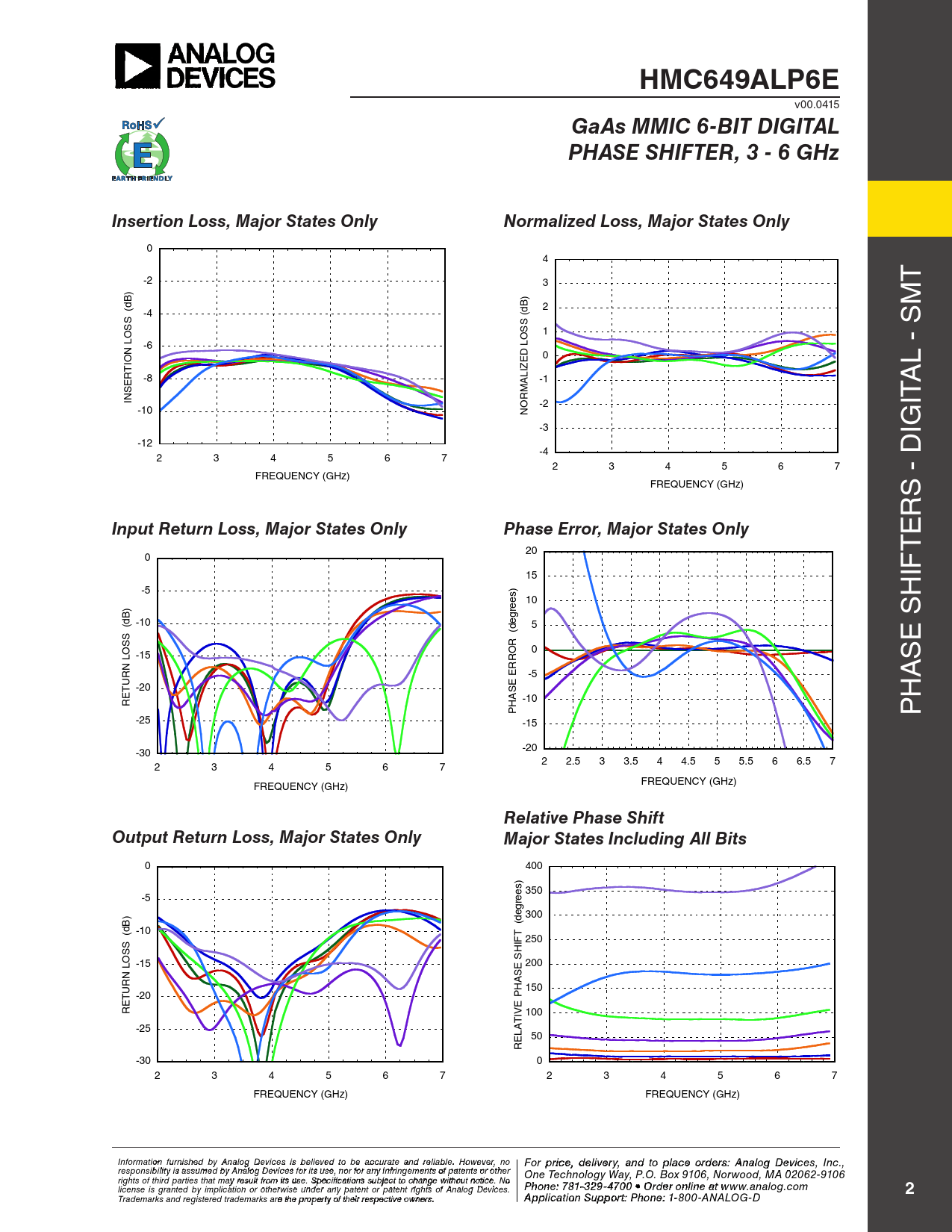HMC649ALP6E v00.0415 GaAs MMIC 6-BIT DIGITALPHASE SHIFTER, 3 - 6 GHzInsertion Loss, Major States OnlyNormalized Loss, Major States Only 0 4 -2 3 T ) B d B) 2 M ( -4 (d S S SS O 1 O L -6 L N 0 IO ED L - S T IZ R -8 E AL -1 S M IN R O -2 ITA -10 N -3 IG -12 -4 2 3 4 5 6 7 2 3 4 5 6 7 FREQUENCY (GHz) FREQUENCY (GHz) S - D R Input Return Loss, Major States OnlyPhase Error, Major States Only E 20 T 0 15 IF -5 ) H 10 ) ees B -10 5 (d S (degr S R E S O O 0 L -15 R S N R E -5 A UR E T -20 S A -10 H RE H P P -25 -15 -20 -30 2 2.5 3 3.5 4 4.5 5 5.5 6 6.5 7 2 3 4 5 6 7 FREQUENCY (GHz) FREQUENCY (GHz) Relative Phase ShiftOutput Return Loss, Major States OnlyMajor States Including All Bits 0 400 ) s e 350 -5 re g ) e 300 B -10 (d T (d 250 S IF S O SH L -15 200 N ASE UR 150 T -20 PH RE IVE 100 -25 AT 50 EL R -30 0 2 3 4 5 6 7 2 3 4 5 6 7 FREQUENCY (GHz) FREQUENCY (GHz) Informat F io o n r p furn risihcee d , d by e An lialvoe g rDy a evic n e d t s is o p belie lva e c d t e o o b rd e a e cc rursa: A te a n n a d lo reli g D able. e H v o ic weveers, I no For price, delivery, and to place orders: Analog Devices, Inc., responsibility is assumed by Analog Devices for its use, nor for any infringements of patents or other nc., 2 Elizabeth Drive, Chelmsford, MA 01824 One Technology Way, P.O. Box 9106, Norwood, MA 02062-9106 Phone: 978-250-3343 • Fax: 978-250-3373 • O rights of third parties that may result from its use. Specifications subject to change without notice. No rd Ph e o r O ne n : 7 -l 81 i-n 3 e a 29-4t w 70 ww 0 • O .h rd iettit r o e nli.c n om license is granted by implication or otherwise under any patent or patent rights of Analog Devices. e at www.analog.com 2 Application Support: Pho Trademarks and registered trademarks are the property of their respective owners.ne: 978-250-33A4 p 3 o plic r a atiopp n S su@ p h po irtttit : Pe. hocno e m : 1-800-ANALOG-D