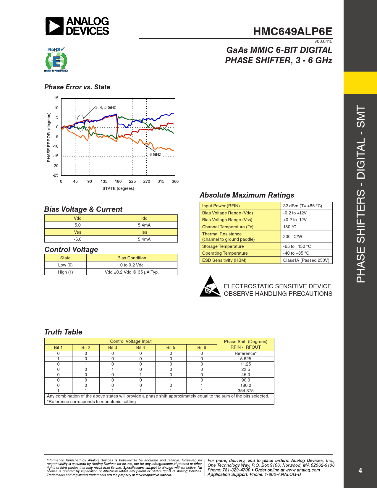 HMC649ALP6E v00.0415 GaAs MMIC 6-BIT DIGITALPHASE SHIFTER, 3 - 6 GHzPhase Error vs. State 15 10 3, 4, 5 GHz T ) 5 ees M 0 (degr R O -5 R R L - S E -10 E S A -15 6 GHz H P ITA -20 IG -25 0 45 90 135 180 225 270 315 360 STATE (degrees) Absolute Maximum Ratings S - D R Input Power (RFIN) 32 dBm (T= +85 °C) Bias Voltage & Current E Bias Voltage Range (Vdd) -0.2 to +12V Vdd Idd T Bias Voltage Range (Vss) +0.2 to -12V 5.0 5.4mA Channel Temperature (Tc) 150 °C IF Vss Iss Thermal Resistance 200 °C/W H -5.0 5.4mA (channel to ground paddle) Storage Temperature -65 to +150 °C Control Voltage Operating Temperature -40 to +85 °C E S State Bias Condition ESD Sensitivity (HBM) Class1A (Passed 250V) S Low (0) 0 to 0.2 Vdc A High (1) Vdd ±0.2 Vdc @ 35 µA Typ. H P ELECTROSTATIC SENSITIVE DEVICE OBSERVE HANDLING PRECAUTIONS Truth Table Control Voltage Input Phase Shift (Degrees) Bit 1 Bit 2 Bit 3 Bit 4 Bit 5 Bit 6 RFIN - RFOUT 0 0 0 0 0 0 Reference* 1 0 0 0 0 0 5.625 0 1 0 0 0 0 11.25 0 0 1 0 0 0 22.5 0 0 0 1 0 0 45.0 0 0 0 0 1 0 90.0 0 0 0 0 0 1 180.0 1 1 1 1 1 1 354.375 Any combination of the above states will provide a phase shift approximately equal to the sum of the bits selected. *Reference corresponds to monotonic setting Informat F io o n r p furn risihcee d , d by e An lialvoe g rDy a evic n e d t s is o p belie lva e c d t e o o b rd e a e cc rursa: A te a n n a d lo reli g D able. e H v o ic weveers, I no For price, delivery, and to place orders: Analog Devices, Inc., responsibility is assumed by Analog Devices for its use, nor for any infringements of patents or other nc., 2 Elizabeth Drive, Chelmsford, MA 01824 One Technology Way, P.O. Box 9106, Norwood, MA 02062-9106 Phone: 978-250-3343 • Fax: 978-250-3373 • O rights of third parties that may result from its use. Specifications subject to change without notice. No rd Ph e o r O ne n : 7 -l 81 i-n 3 e a 29-4t w 70 ww 0 • O .h rd iettit r o e nli.c n om license is granted by implication or otherwise under any patent or patent rights of Analog Devices. e at www.analog.com 4 Application Support: Pho Trademarks and registered trademarks are the property of their respective owners.ne: 978-250-33A4 p 3 o plic r a atiopp n S su@ p h po irtttit : Pe. hocno e m : 1-800-ANALOG-D
