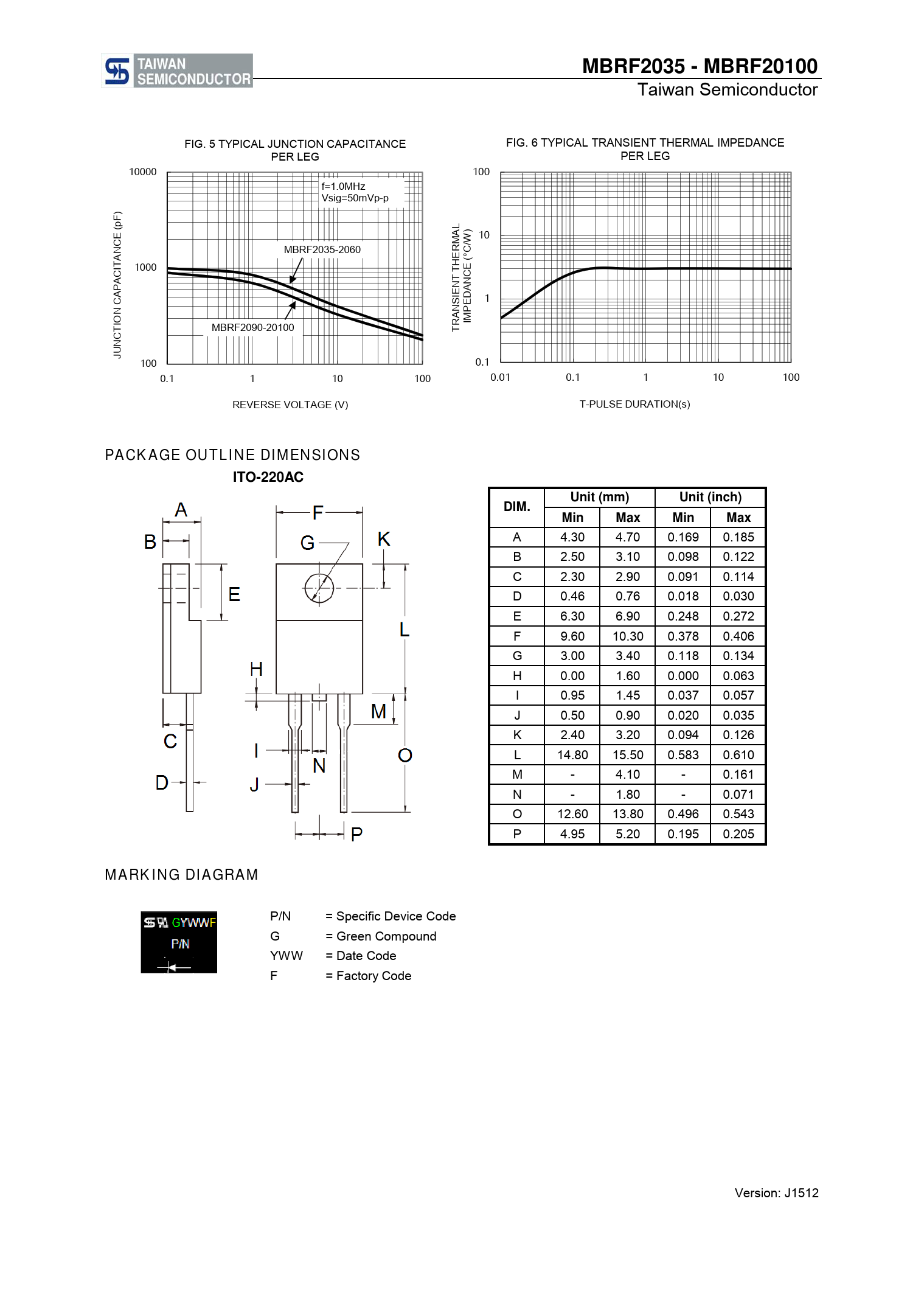 MBRF2035 - MBRF20100 Taiwan Semiconductor CREAT BY ART FIG. 5 TYPICAL JUNCTION CAPACITANCE FIG. 6 TYPICAL TRANSIENT THERMAL IMPEDANCE PER LEG PER LEG 10000 100 f=1.0MHz Vsig=50mVp-p A (pF) L ) E A 10 C M /W MBRF2035-2060 ER °C ITAN 1000 E ( T TH C N A APAC SIEN 1 C PED AN IM TION MBRF2090-20100 TR C N JU 100 0.1 0.1 1 10 100 0.01 0.1 1 10 100 REVERSE VOLTAGE (V) T-PULSE DURATION(s) PACKAGE OUTLINE DIMENSIONSITO-220ACUnit (mm)Unit (inch)DIM.MinMaxMinMax A 4.30 4.70 0.169 0.185 B 2.50 3.10 0.098 0.122 C 2.30 2.90 0.091 0.114 D 0.46 0.76 0.018 0.030 E 6.30 6.90 0.248 0.272 F 9.60 10.30 0.378 0.406 G 3.00 3.40 0.118 0.134 H 0.00 1.60 0.000 0.063 I 0.95 1.45 0.037 0.057 J 0.50 0.90 0.020 0.035 K 2.40 3.20 0.094 0.126 L 14.80 15.50 0.583 0.610 M - 4.10 - 0.161 N - 1.80 - 0.071 O 12.60 13.80 0.496 0.543 P 4.95 5.20 0.195 0.205 MARKING DIAGRAM P/N = Specific Device Code G = Green Compound YWW = Date Code F = Factory Code Version: J1512