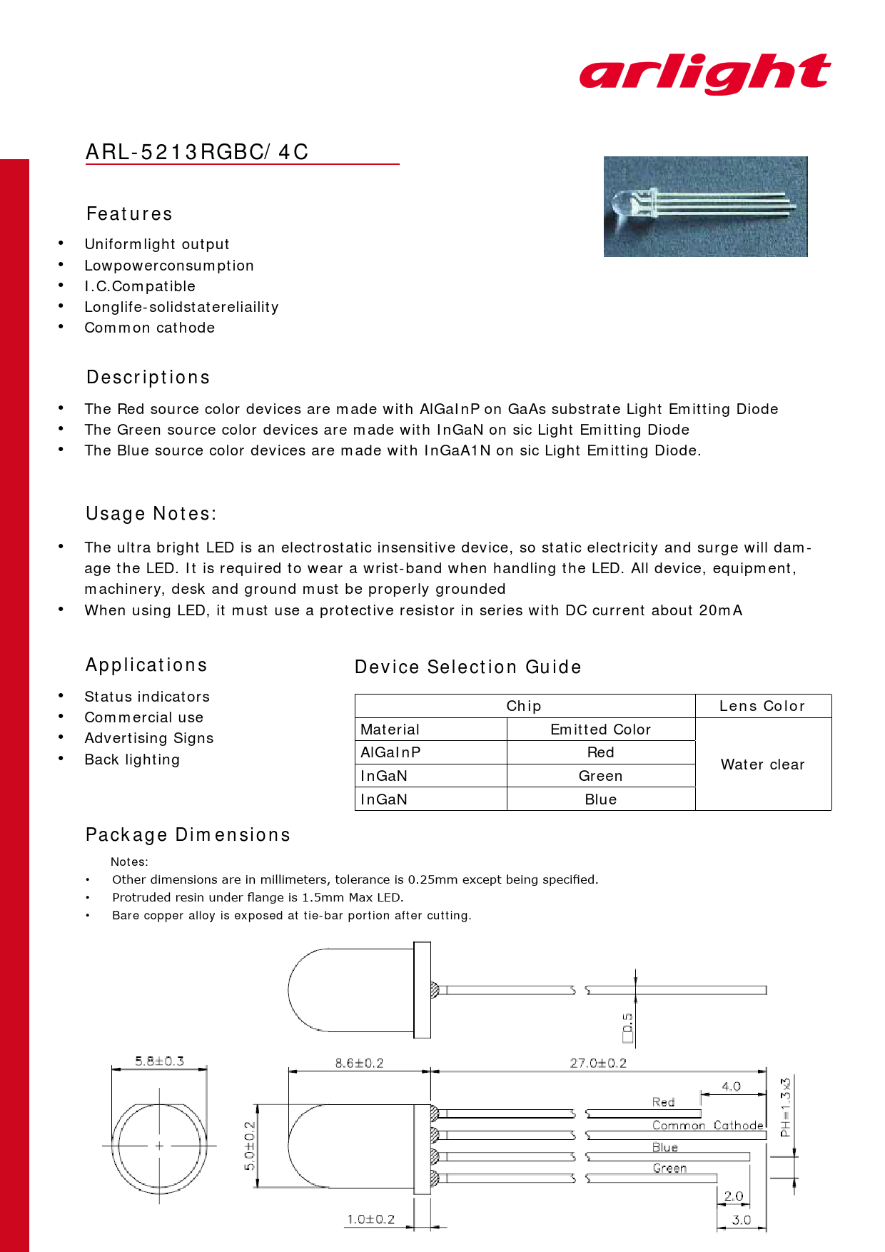 ARL-5213RGBC/4C. Features. Descriptions. Usage Notes:. Applications. Device Selection Guide. Chip. Lens Color. Package Dimensions