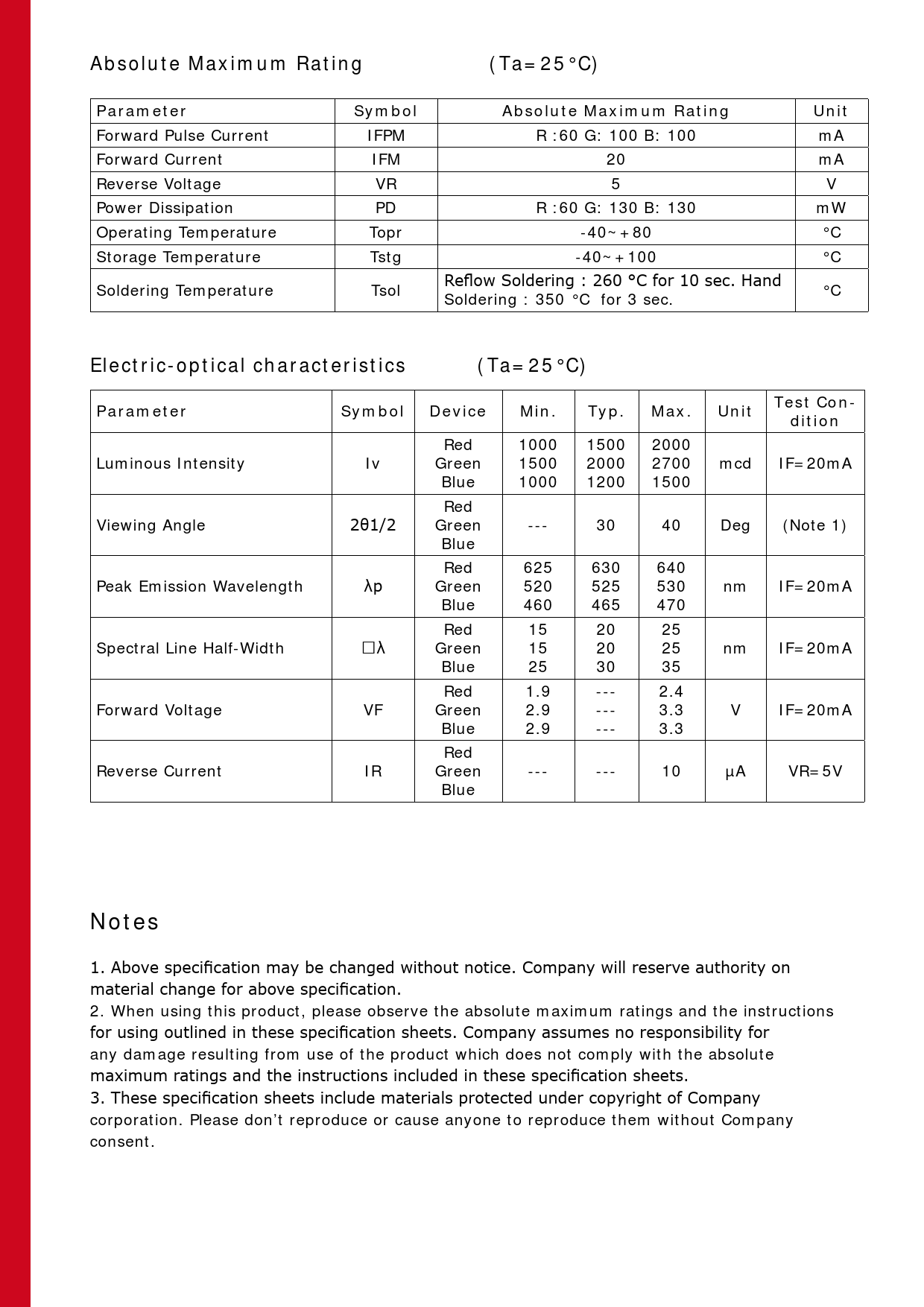 Absolute Maximum Rating(Ta=25°C)ParameterSymbolAbsolute Maximum RatingUnit Forward Pulse Current IFPM R :60 G: 100 B: 100 mA Forward Current IFM 20 mA Reverse Voltage VR 5 V Power Dissipation PD R :60 G: 130 B: 130 mW Operating Temperature Topr -40~+80 °C Storage Temperature Tstg -40~+100 °C Soldering Temperature Tsol Reflow Soldering : 260 °C for 10 sec. Hand Soldering : 350 °C for 3 sec. °C Electric-optical characteristics (Ta=25°C)ParameterSymbolDeviceMin.Typ.Max.UnitTest Con-dition Red 1000 1500 2000 Luminous Intensity Iv Green 1500 2000 2700 mcd IF=20mA Blue 1000 1200 1500 Red Viewing Angle 2θ1/2 Green --- 30 40 Deg (Note 1) Blue Red 625 630 640 Peak Emission Wavelength λp Green 520 525 530 nm IF=20mA Blue 460 465 470 Red 15 20 25 Spectral Line Half-Width △λ Green 15 20 25 nm IF=20mA Blue 25 30 35 Red 1.9 --- 2.4 Forward Voltage VF Green 2.9 --- 3.3 V IF=20mA Blue 2.9 --- 3.3 Red Reverse Current IR Green --- --- 10 µA VR=5V Blue Notes 1. Above specification may be changed without notice. Company will reserve authority on material change for above specification. 2. When using this product, please observe the absolute maximum ratings and the instructions for using outlined in these specification sheets. Company assumes no responsibility for any damage resulting from use of the product which does not comply with the absolute maximum ratings and the instructions included in these specification sheets. 3. These specification sheets include materials protected under copyright of Company corporation. Please don’t reproduce or cause anyone to reproduce them without Company consent.
