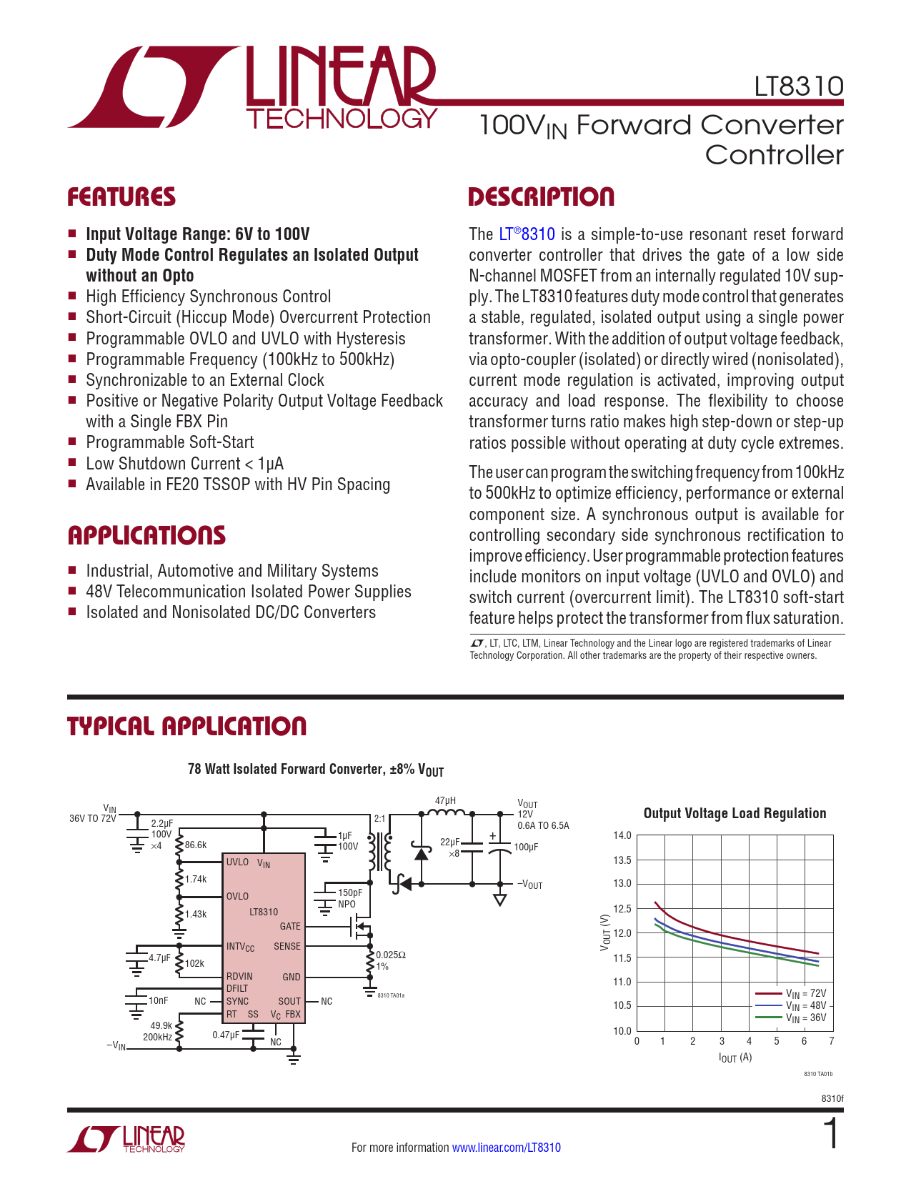 LT8310 100VIN Forward Converter Controller FeaTuresDescripTion n Input Voltage Range: 6V to 100V The LT®8310 is a simple-to-use resonant reset forward n Duty Mode Control Regulates an Isolated Output converter controller that drives the gate of a low side without an Opto N-channel MOSFET from an internally regulated 10V sup- n High Efficiency Synchronous Control ply. The LT8310 features duty mode control that generates n Short-Circuit (Hiccup Mode) Overcurrent Protection a stable, regulated, isolated output using a single power n Programmable OVLO and UVLO with Hysteresis transformer. With the addition of output voltage feedback, n Programmable Frequency (100kHz to 500kHz) via opto-coupler (isolated) or directly wired (nonisolated), n Synchronizable to an External Clock current mode regulation is activated, improving output n Positive or Negative Polarity Output Voltage Feedback accuracy and load response. The flexibility to choose with a Single FBX Pin transformer turns ratio makes high step-down or step-up n Programmable Soft-Start ratios possible without operating at duty cycle extremes. n Low Shutdown Current < 1µA The user can program the switching frequency from 100kHz n Available in FE20 TSSOP with HV Pin Spacing to 500kHz to optimize efficiency, performance or external component size. A synchronous output is available for applicaTions controlling secondary side synchronous rectification to improve efficiency. User programmable protection features n Industrial, Automotive and Military Systems include monitors on input voltage (UVLO and OVLO) and n 48V Telecommunication Isolated Power Supplies switch current (overcurrent limit). The LT8310 soft-start n Isolated and Nonisolated DC/DC Converters feature helps protect the transformer from flux saturation. L, LT, LTC, LTM, Linear Technology and the Linear logo are registered trademarks of Linear Technology Corporation. All other trademarks are the property of their respective owners. Typical applicaTion78 Watt Isolated Forward Converter, ±8% VOUT 47µH V V IN OUT 12V 2:1 Output Voltage Load Regulation 36V TO 72V 2.2µF 0.6A TO 6.5A 100V 1µF • • + 14.0 ×4 86.6k 100V 22µF 100µF ×8 UVLO VIN 13.5 1.74k –VOUT 13.0 OVLO 150pF NPO LT8310 1.43k 12.5 GATE (V) 12.0 INTVCC SENSE V OUT 4.7µF 0.025Ω 102k 11.5 1% RDVIN GND DFILT 11.0 V NC SYNC SOUT NC 8310 TA01a 10nF IN = 72V 10.5 V RT SS V IN = 48V C FBX V 49.9k IN = 36V 200kHz 0.47µF 10.0 –V NC 0 1 2 3 4 5 6 7 IN IOUT (A) 8310 TA01b 8310f For more information www.linear.com/LT8310 1 Document Outline Features Applications Typical Application Description Absolute Maximum Ratings Order Information Pin Configuration Electrical Characteristics Typical Performance Characteristics Pin Functions Block Diagram Timing Diagrams Operation Applications Information Typical Applications Package Description Typical Application Related Parts