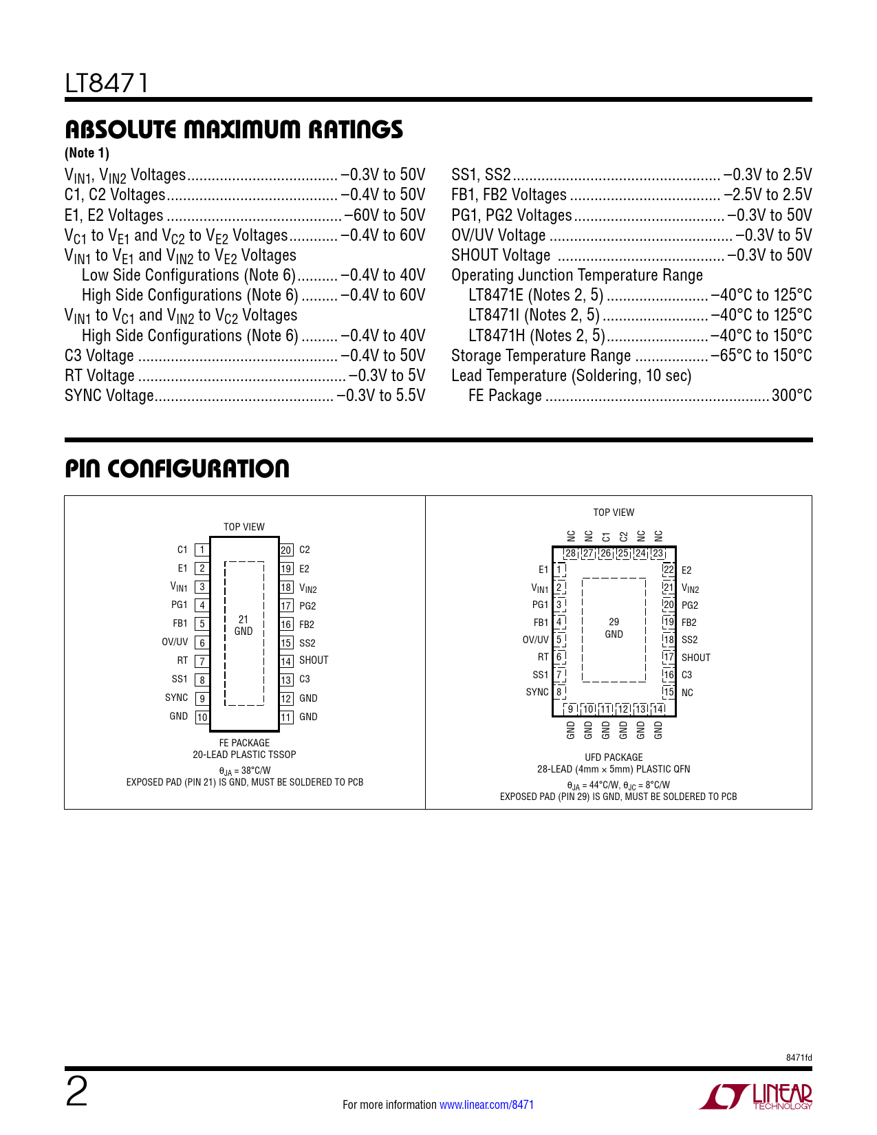 VIN1, VIN2 Voltages ... –0.3V to 50V SS1, SS2 ... –0.3V to 2.5V C1, C2 Voltages .. –0.4V to 50V FB1, FB2 Voltages ... –2.5V to 2.5V E1, E2 Voltages ... –60V to 50V PG1, PG2 Voltages ... –0.3V to 50V VC1 to VE1 and VC2 to VE2 Voltages .. –0.4V to 60V OV/UV Voltage ... –0.3V to 5V VIN1 to VE1 and VIN2 to VE2 Voltages SHOUT Voltage ... –0.3V to 50V Low Side Configurations (Note 6) .. –0.4V to 40V Operating Junction Temperature Range High Side Configurations (Note 6) ... –0.4V to 60V LT8471E (Notes 2, 5) ... –40°C to 125°C VIN1 to VC1 and VIN2 to VC2 Voltages LT8471I (Notes 2, 5) .. –40°C to 125°C High Side Configurations (Note 6) ... –0.4V to 40V LT8471H (Notes 2, 5) ... –40°C to 150°C C3 Voltage ... –0.4V to 50V Storage Temperature Range .. –65°C to 150°C RT Voltage ... –0.3V to 5V Lead Temperature (Soldering, 10 sec) SYNC Voltage .. –0.3V to 5.5V FE Package ...300°C