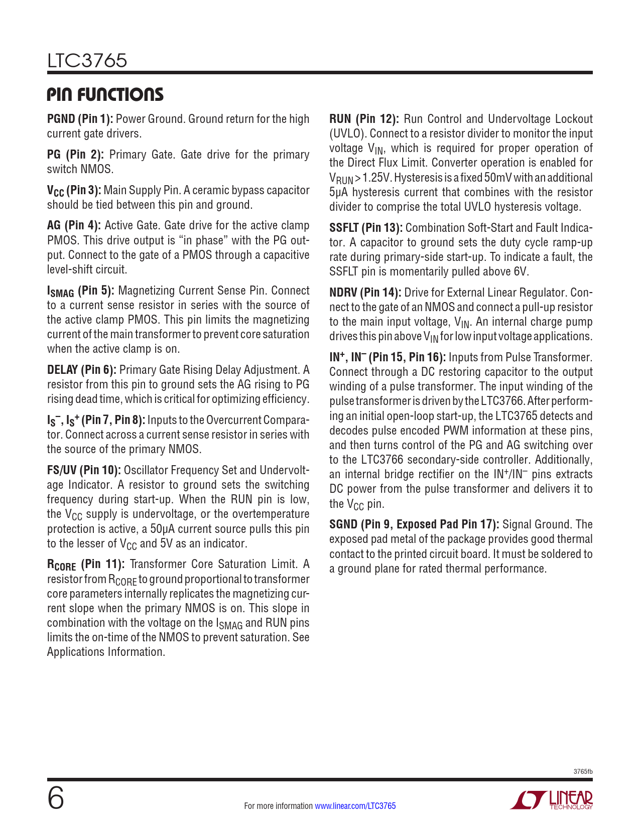 LTC3765 PIN FUNCTIONSPGND (Pin 1): Power Ground. Ground return for the high RUN (Pin 12): Run Control and Undervoltage Lockout current gate drivers. (UVLO). Connect to a resistor divider to monitor the input PG (Pin 2): Primary Gate. Gate drive for the primary voltage VIN, which is required for proper operation of switch NMOS. the Direct Flux Limit. Converter operation is enabled for VRUN > 1.25V. Hysteresis is a fixed 50mV with an additional VCC (Pin 3): Main Supply Pin. A ceramic bypass capacitor 5µA hysteresis current that combines with the resistor should be tied between this pin and ground. divider to comprise the total UVLO hysteresis voltage. AG (Pin 4): Active Gate. Gate drive for the active clamp SSFLT (Pin 13): Combination Soft-Start and Fault Indica- PMOS. This drive output is “in phase” with the PG out- tor. A capacitor to ground sets the duty cycle ramp-up put. Connect to the gate of a PMOS through a capacitive rate during primary-side start-up. To indicate a fault, the level-shift circuit. SSFLT pin is momentarily pulled above 6V. ISMAG (Pin 5): Magnetizing Current Sense Pin. Connect NDRV (Pin 14): Drive for External Linear Regulator. Con- to a current sense resistor in series with the source of nect to the gate of an NMOS and connect a pull-up resistor the active clamp PMOS. This pin limits the magnetizing to the main input voltage, VIN. An internal charge pump current of the main transformer to prevent core saturation drives this pin above VIN for low input voltage applications. when the active clamp is on. IN+, IN– (Pin 15, Pin 16): Inputs from Pulse Transformer. DELAY (Pin 6): Primary Gate Rising Delay Adjustment. A Connect through a DC restoring capacitor to the output resistor from this pin to ground sets the AG rising to PG winding of a pulse transformer. The input winding of the rising dead time, which is critical for optimizing efficiency. pulse transformer is driven by the LTC3766. After perform- I – + ing an initial open-loop start-up, the LTC3765 detects and S , IS (Pin 7, Pin 8): Inputs to the Overcurrent Compara- tor. Connect across a current sense resistor in series with decodes pulse encoded PWM information at these pins, the source of the primary NMOS. and then turns control of the PG and AG switching over to the LTC3766 secondary-side controller. Additionally, FS/UV (Pin 10): Oscillator Frequency Set and Undervolt- an internal bridge rectifier on the IN+/IN– pins extracts age Indicator. A resistor to ground sets the switching DC power from the pulse transformer and delivers it to frequency during start-up. When the RUN pin is low, the V the V CC pin. CC supply is undervoltage, or the overtemperature protection is active, a 50µA current source pulls this pin SGND (Pin 9, Exposed Pad Pin 17): Signal Ground. The to the lesser of V exposed pad metal of the package provides good thermal CC and 5V as an indicator. contact to the printed circuit board. It must be soldered to RCORE (Pin 11): Transformer Core Saturation Limit. A a ground plane for rated thermal performance. resistor from RCORE to ground proportional to transformer core parameters internally replicates the magnetizing cur- rent slope when the primary NMOS is on. This slope in combination with the voltage on the ISMAG and RUN pins limits the on-time of the NMOS to prevent saturation. See Applications Information. 3765fb 6 For more information www.linear.com/LTC3765 Document Outline Features Applications Description Typical Application Absolute Maximum Ratings Pin Configuration Order Information Electrical Characteristics Typical Performance Characteristics Pin Functions Block Diagram Timing Diagram Operation Applications Information Package Description Revision History Typical Application Related Parts
