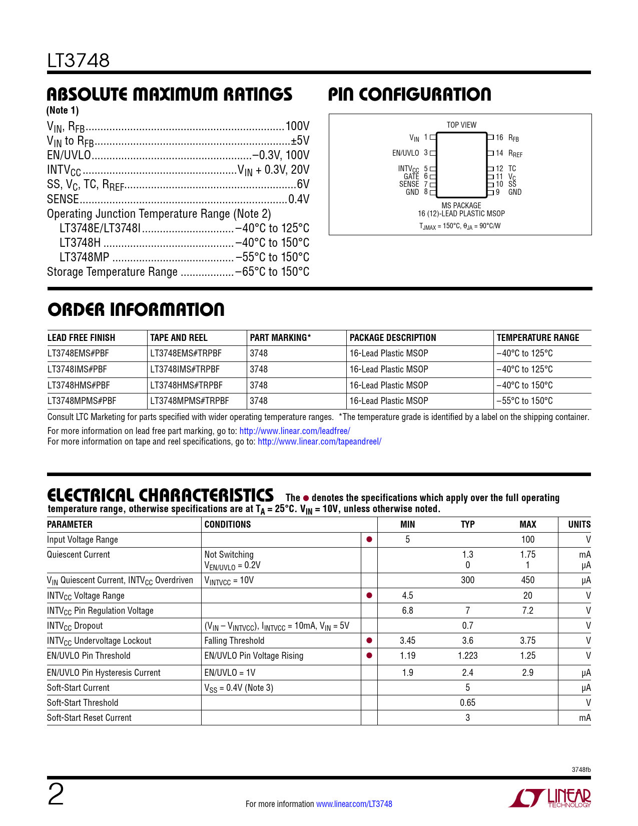 LT3748 absolute MaxiMuM ratingspin conFiguration(Note 1) VIN, RFB ...100V TOP VIEW V V 1 16 R IN to RFB ..±5V IN FB EN/UVLO ..–0.3V, 100V EN/UVLO 3 14 RREF INTVCC ..VIN + 0.3V, 20V INTV 5 CC 12 TC SS, V GATE 6 11 VC C, TC, RREF..6V SENSE 7 10 SS SENSE ..0.4V GND 8 9 GND Operating Junction Temperature Range (Note 2) MS PACKAGE 16 (12)-LEAD PLASTIC MSOP LT3748E/LT3748I ... –40°C to 125°C TJMAX = 150°C, θJA = 90°C/W LT3748H .. –40°C to 150°C LT3748MP ... –55°C to 150°C Storage Temperature Range ..–65°C to 150°C orDer inForMationLEAD FREE FINISHTAPE AND REELPART MARKING*PACKAGE DESCRIPTIONTEMPERATURE RANGE LT3748EMS#PBF LT3748EMS#TRPBF 3748 16-Lead Plastic MSOP –40°C to 125°C LT3748IMS#PBF LT3748IMS#TRPBF 3748 16-Lead Plastic MSOP –40°C to 125°C LT3748HMS#PBF LT3748HMS#TRPBF 3748 16-Lead Plastic MSOP –40°C to 150°C LT3748MPMS#PBF LT3748MPMS#TRPBF 3748 16-Lead Plastic MSOP –55°C to 150°C Consult LTC Marketing for parts specified with wider operating temperature ranges. *The temperature grade is identified by a label on the shipping container. For more information on lead free part marking, go to: http://www.linear.com/leadfree/ For more information on tape and reel specifications, go to: http://www.linear.com/tapeandreel/ e lectrical characteristics The l denotes the specifications which apply over the full operatingtemperature range, otherwise specifications are at TA = 25°C. VIN = 10V, unless otherwise noted.PARAMETERCONDITIONSMINTYPMAXUNITS Input Voltage Range l 5 100 V Quiescent Current Not Switching 1.3 1.75 mA VEN/UVLO = 0.2V 0 1 µA VIN Quiescent Current, INTVCC Overdriven VINTVCC = 10V 300 450 µA INTVCC Voltage Range l 4.5 20 V INTVCC Pin Regulation Voltage 6.8 7 7.2 V INTVCC Dropout (VIN – VINTVCC), IINTVCC = 10mA, VIN = 5V 0.7 V INTVCC Undervoltage Lockout Falling Threshold l 3.45 3.6 3.75 V EN/UVLO Pin Threshold EN/UVLO Pin Voltage Rising l 1.19 1.223 1.25 V EN/UVLO Pin Hysteresis Current EN/UVLO = 1V 1.9 2.4 2.9 µA Soft-Start Current VSS = 0.4V (Note 3) 5 µA Soft-Start Threshold 0.65 V Soft-Start Reset Current 3 mA 3748fb 2 For more information www.linear.com/LT3748 Document Outline Features Applications Description Typical Application Absolute Maximum Ratings Pin Configuration order information Electrical Characteristics Typical Performance Characteristics Pin Functions block diagram Operation Applications Information Package Description Typical Application Related Parts