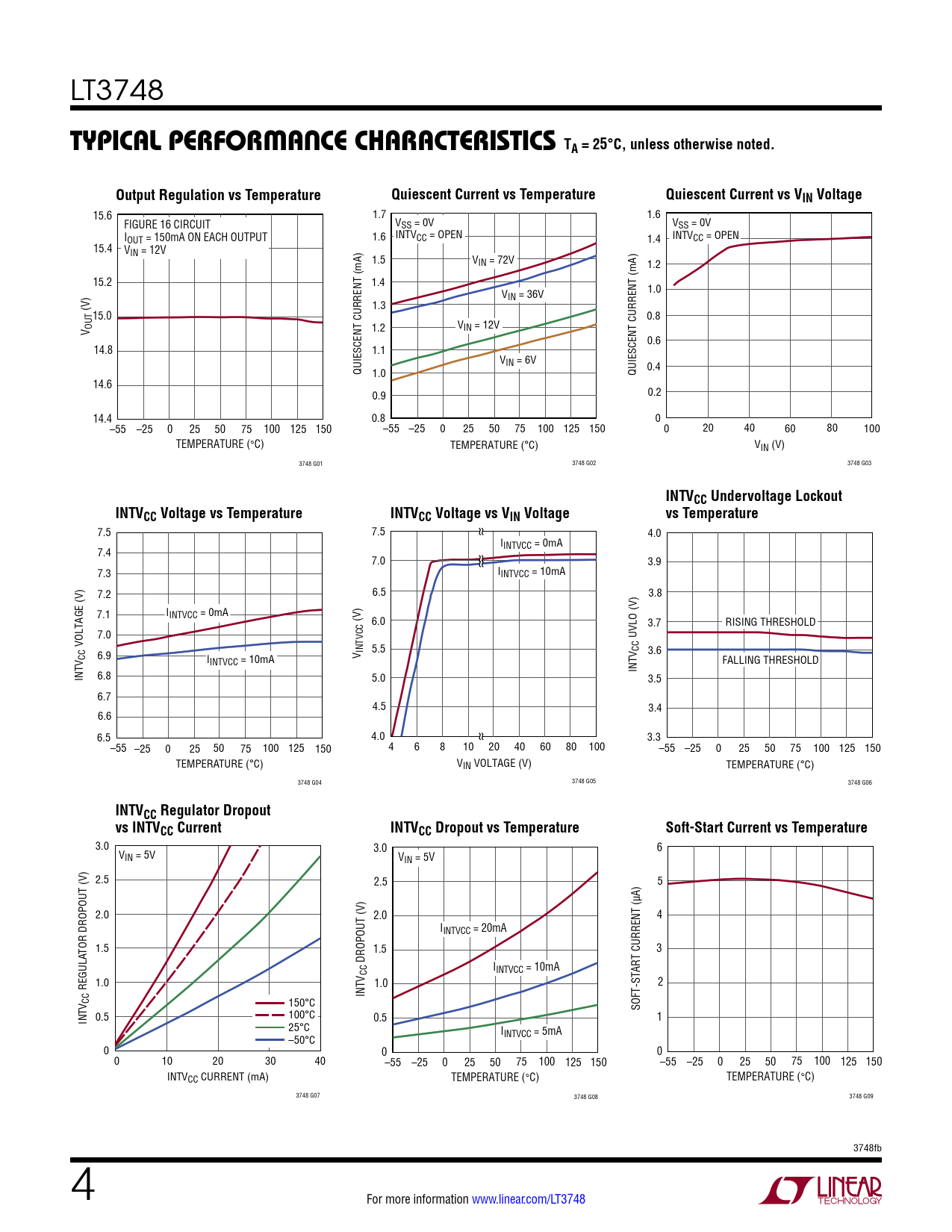 15.6 1.7 1.6 FIGURE 16 CIRCUIT VSS = 0V VSS = 0V IOUT = 150mA ON EACH OUTPUT 1.6 INTVCC = OPEN 1.4 INTVCC = OPEN 15.4 VIN = 12V 1.5 VIN = 72V 1.2 15.2 1.4 V 1.0 IN = 36V (V) 1.3 15.0 0.8 V V OUT 1.2 IN = 12V 0.6 14.8 1.1 VIN = 6V QUIESCENT CURRENT (mA) 1.0 QUIESCENT CURRENT (mA) 0.4 14.6 0.9 0.2 14.4 0.8 0 –55 –25 0 25 50 75 100 125 150 –55 –25 0 25 50 75 100 125 150 0 20 40 60 80 100 TEMPERATURE (°C) TEMPERATURE (°C) VIN (V) 3748 G01 3748 G02 3748 G03