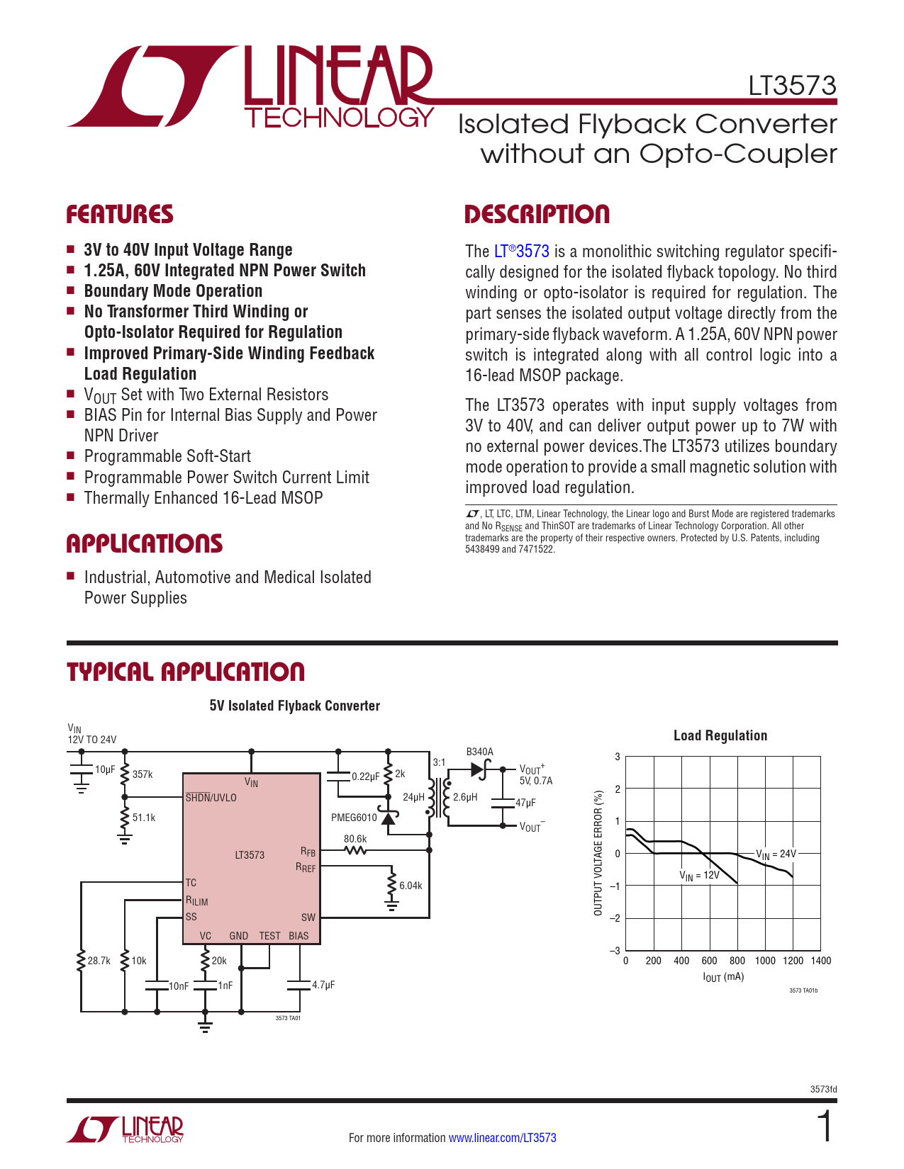 LT3573 Isolated Flyback Converter without an Opto-Coupler FEATURESDESCRIPTION n 3V to 40V Input Voltage Range The LT®3573 is a monolithic switching regulator specifi- n 1.25A, 60V Integrated NPN Power Switch cally designed for the isolated flyback topology. No third n Boundary Mode Operation winding or opto-isolator is required for regulation. The n No Transformer Third Winding or part senses the isolated output voltage directly from the Opto-Isolator Required for Regulation primary-side flyback waveform. A 1.25A, 60V NPN power n Improved Primary-Side Winding Feedback switch is integrated along with all control logic into a Load Regulation 16-lead MSOP package. n VOUT Set with Two External Resistors The LT3573 operates with input supply voltages from n BIAS Pin for Internal Bias Supply and Power 3V to 40V, and can deliver output power up to 7W with NPN Driver no external power devices.The LT3573 utilizes boundary n Programmable Soft-Start mode operation to provide a small magnetic solution with n Programmable Power Switch Current Limit improved load regulation. n Thermally Enhanced 16-Lead MSOP L, LT, LTC, LTM, Linear Technology, the Linear logo and Burst Mode are registered trademarks and No R APPLICATIONS SENSE and ThinSOT are trademarks of Linear Technology Corporation. All other trademarks are the property of their respective owners. Protected by U.S. Patents, including 5438499 and 7471522. n Industrial, Automotive and Medical Isolated Power Supplies TYPICAL APPLICATION5V Isolated Flyback Converter VIN 12V TO 24V Load Regulation B340A 3:1 3 10µF V + OUT 357k 2k V 0.22µF 5V, 0.7A IN 2 SHDN/UVLO 24µH 2.6µH 47µF 51.1k PMEG6010 V – 1 OUT 80.6k RFB LT3573 TAGE ERROR (%) 0 VIN = 24V RREF V TC IN = 12V 6.04k –1 RILIM SS SW OUTPUT VOL –2 VC GND TEST BIAS –3 28.7k 10k 20k 0 200 400 600 800 1000 1200 1400 IOUT (mA) 10nF 1nF 4.7µF 3573 TA01b 3573 TA01 3573fd For more information www.linear.com/LT3573 1 Document Outline Features Applications Description Typical Application Absolute Maximum Ratings Pin Configuration Order Information Electrical Characteristics Typical Performance Characteristics Pin Functions Block Diagram Operation Applications Information Typical Applications Package Description Revision History Typical Application Related Parts