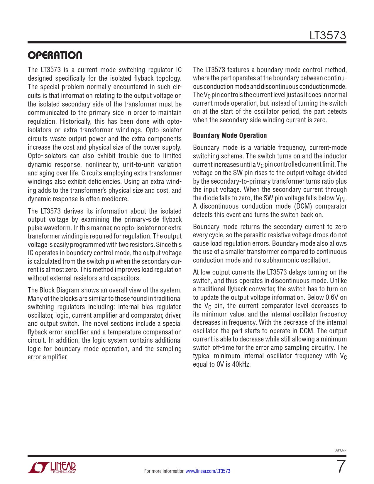 The LT3573 is a current mode switching regulator IC The LT3573 features a boundary mode control method, designed specifically for the isolated flyback topology. where the part operates at the boundary between continu- The special problem normally encountered in such cir- ous conduction mode and discontinuous conduction mode. cuits is that information relating to the output voltage on The VC pin controls the current level just as it does in normal the isolated secondary side of the transformer must be current mode operation, but instead of turning the switch communicated to the primary side in order to maintain on at the start of the oscillator period, the part detects regulation. Historically, this has been done with opto- when the secondary side winding current is zero. isolators or extra transformer windings. Opto-isolator circuits waste output power and the extra components